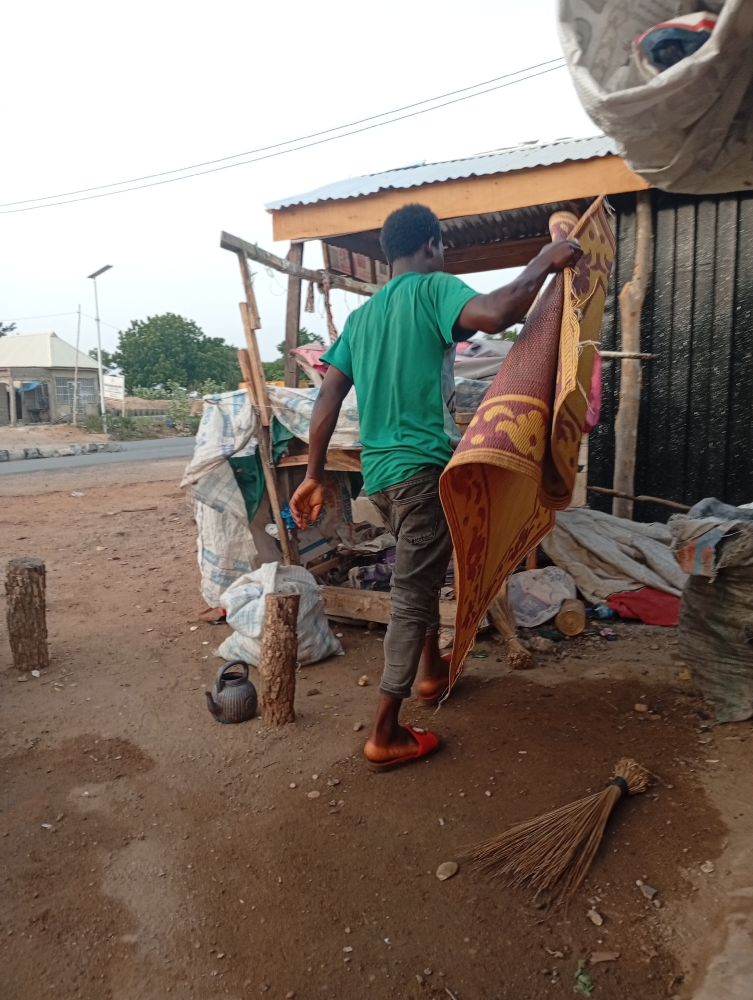 The image shows a person in Adankolo, Nigeria holding up a rectangular mat with brown, yellow, and red geometric patterns. The person is wearing a green t-shirt, gray pants, and orange sandals. The lo…read more