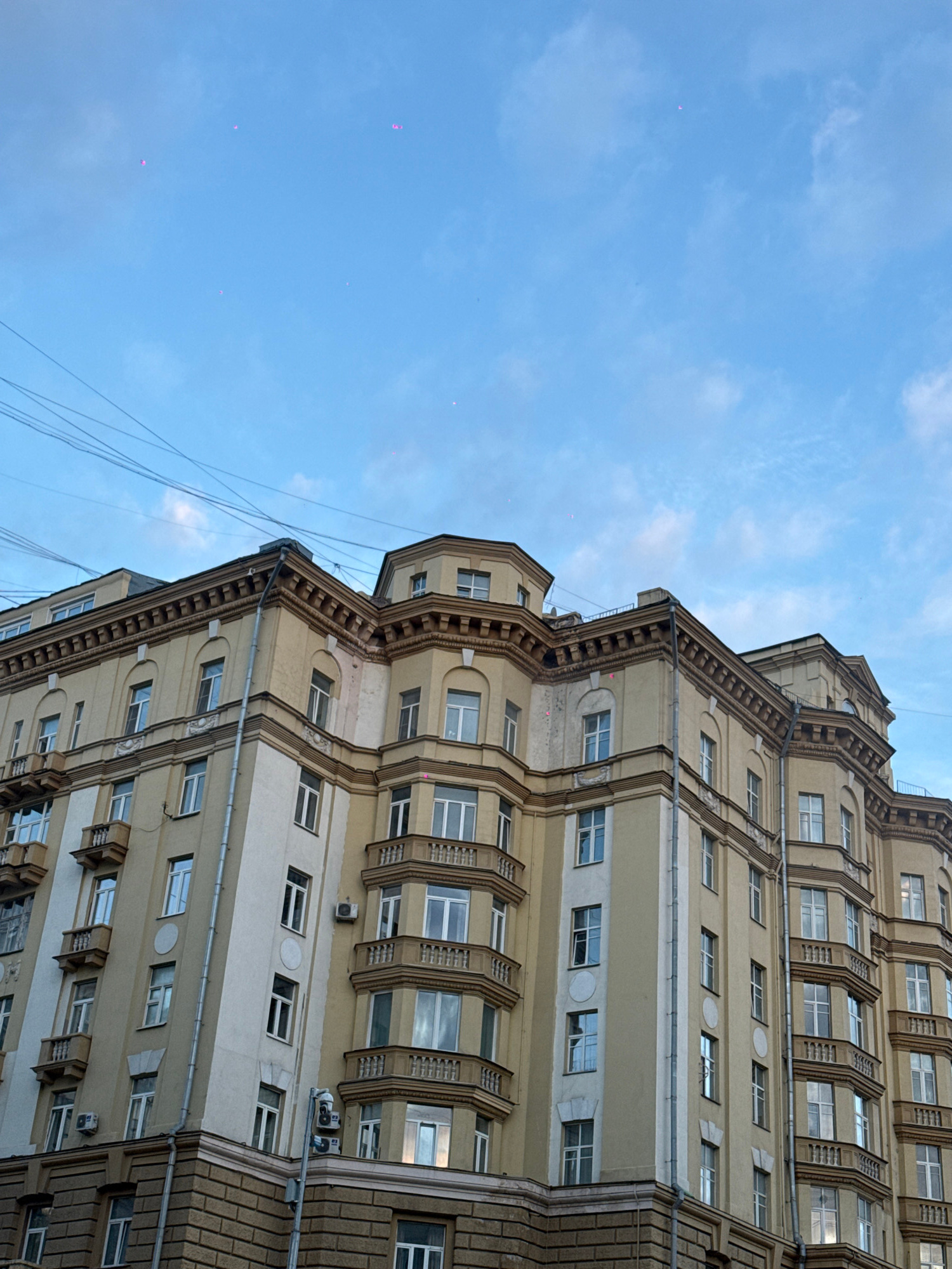 The image shows a tall, light-colored building with multiple floors in Moscow, Russia. The building's facade has decorative molding and multiple windows on each floor. The sky is blue with scattered c…read more