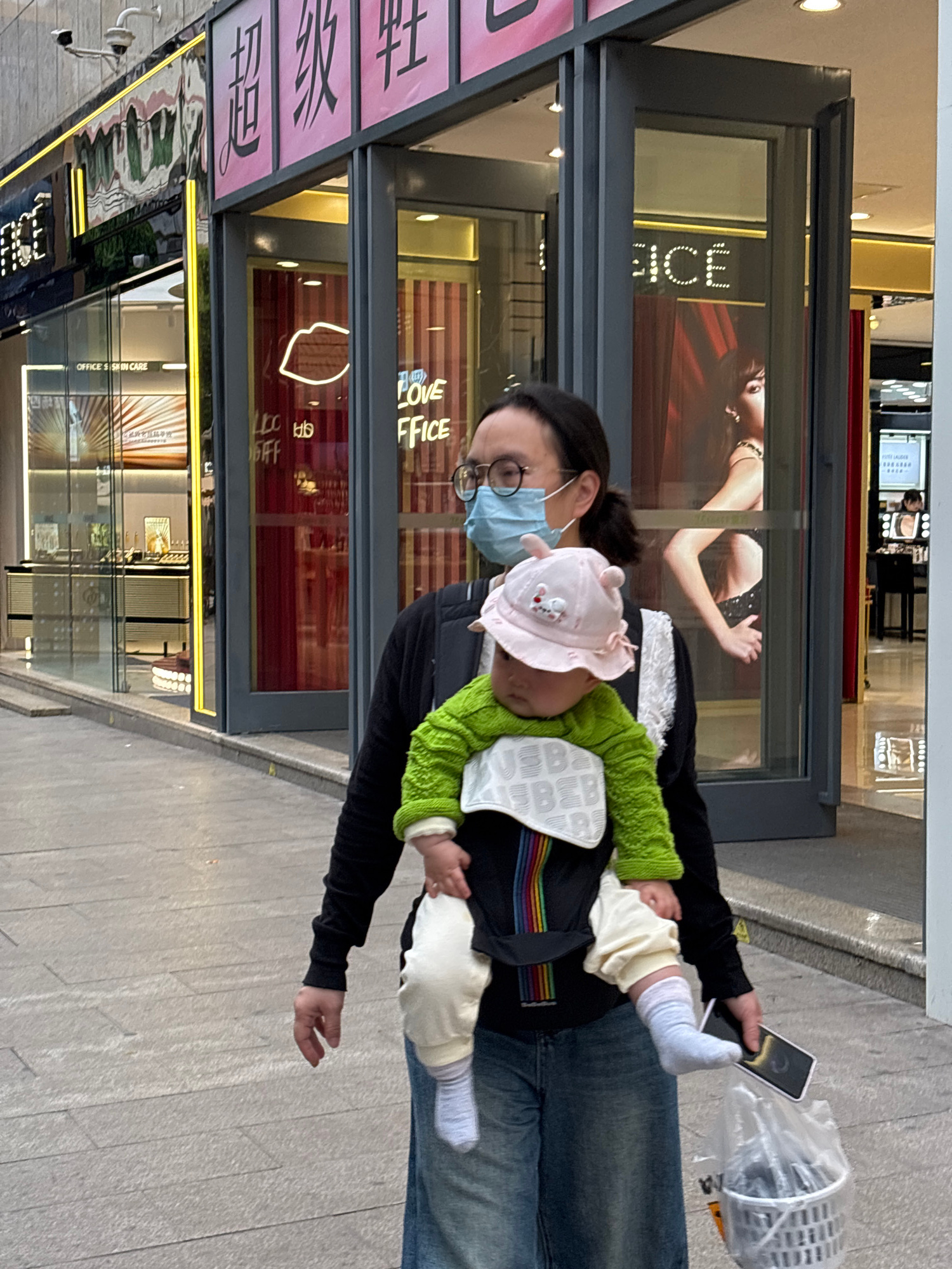 A medium, street-level shot captures a person carrying a baby in front of storefronts, possibly located in Jiangjin, China. The person, likely a parent, wears glasses and a blue face mask and is dress…read more