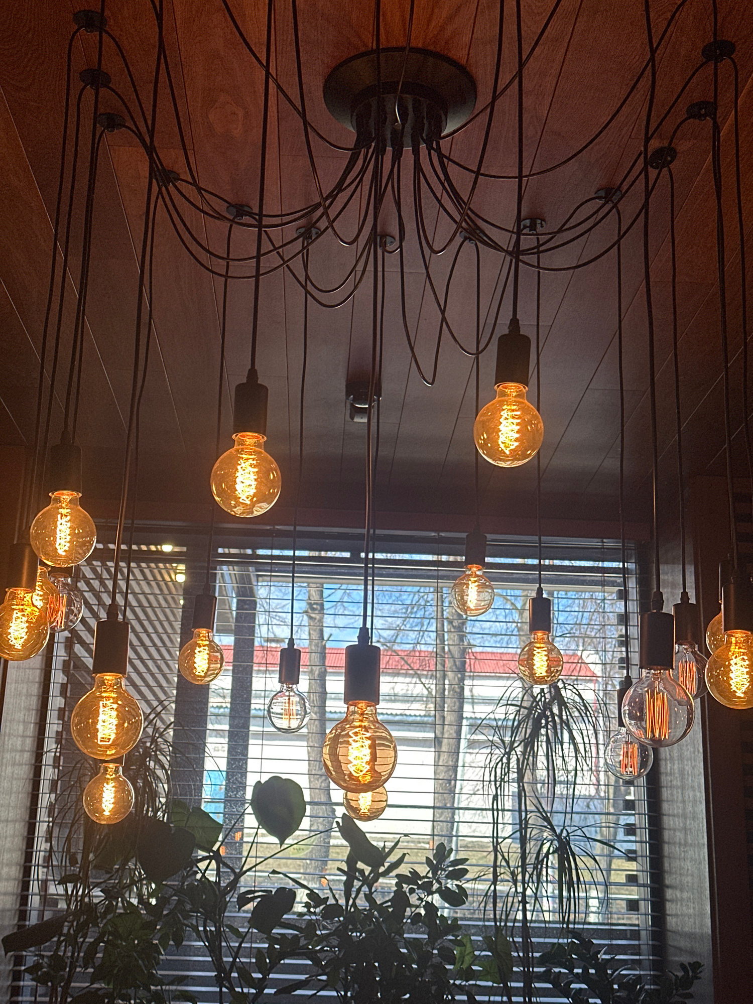 The image shows a cluster of Edison-style light bulbs suspended from a central point on a dark-paneled wall. The bulbs hang at varying heights, their filaments glowing warmly. Thin black wires connect…read more