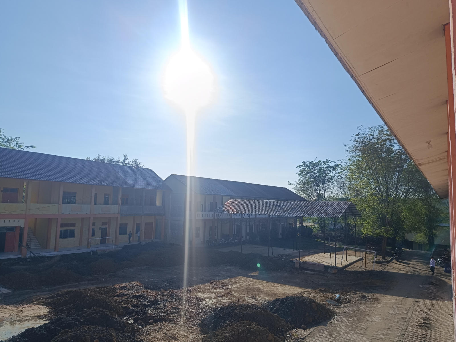 The image depicts an outdoor scene in Lhokseumawe, Indonesia. Two, two-story buildings are visible, one yellow and the other gray. In front of the buildings is an area of disturbed earth, with mounds…read more