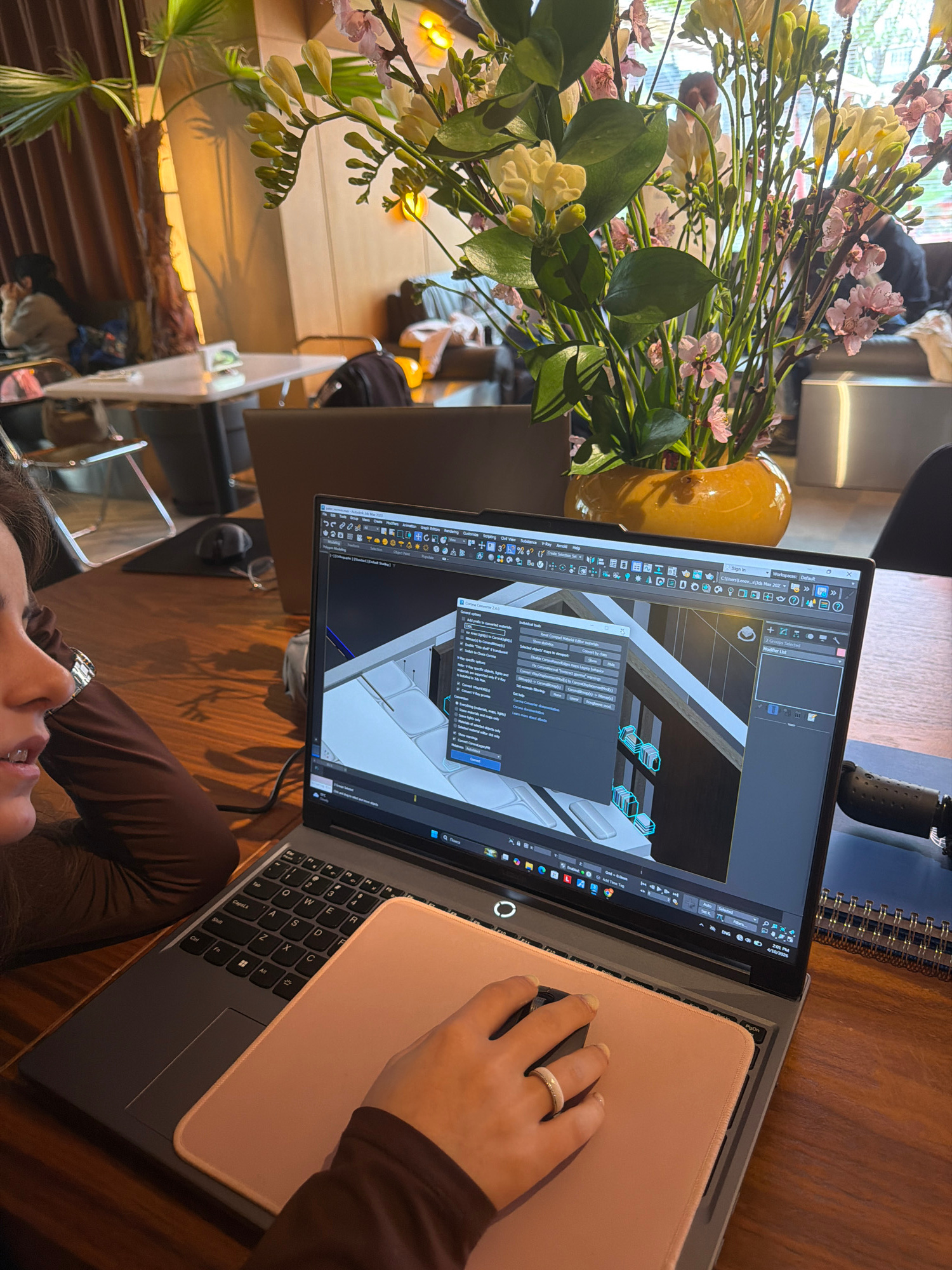 Here is a description of the image: The image shows a person working on a laptop in what appears to be an indoor setting, possibly a cafe or workspace. The laptop screen displays a 3D modeling or arc…read more