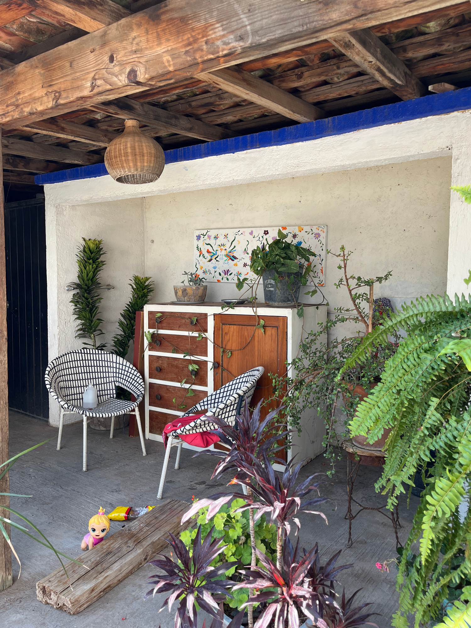The image depicts an outdoor patio in what is likely Puebla, Mexico, given the architectural style and decor. The patio is enclosed by white walls and a wooden beam roof structure, painted with blue t…read more