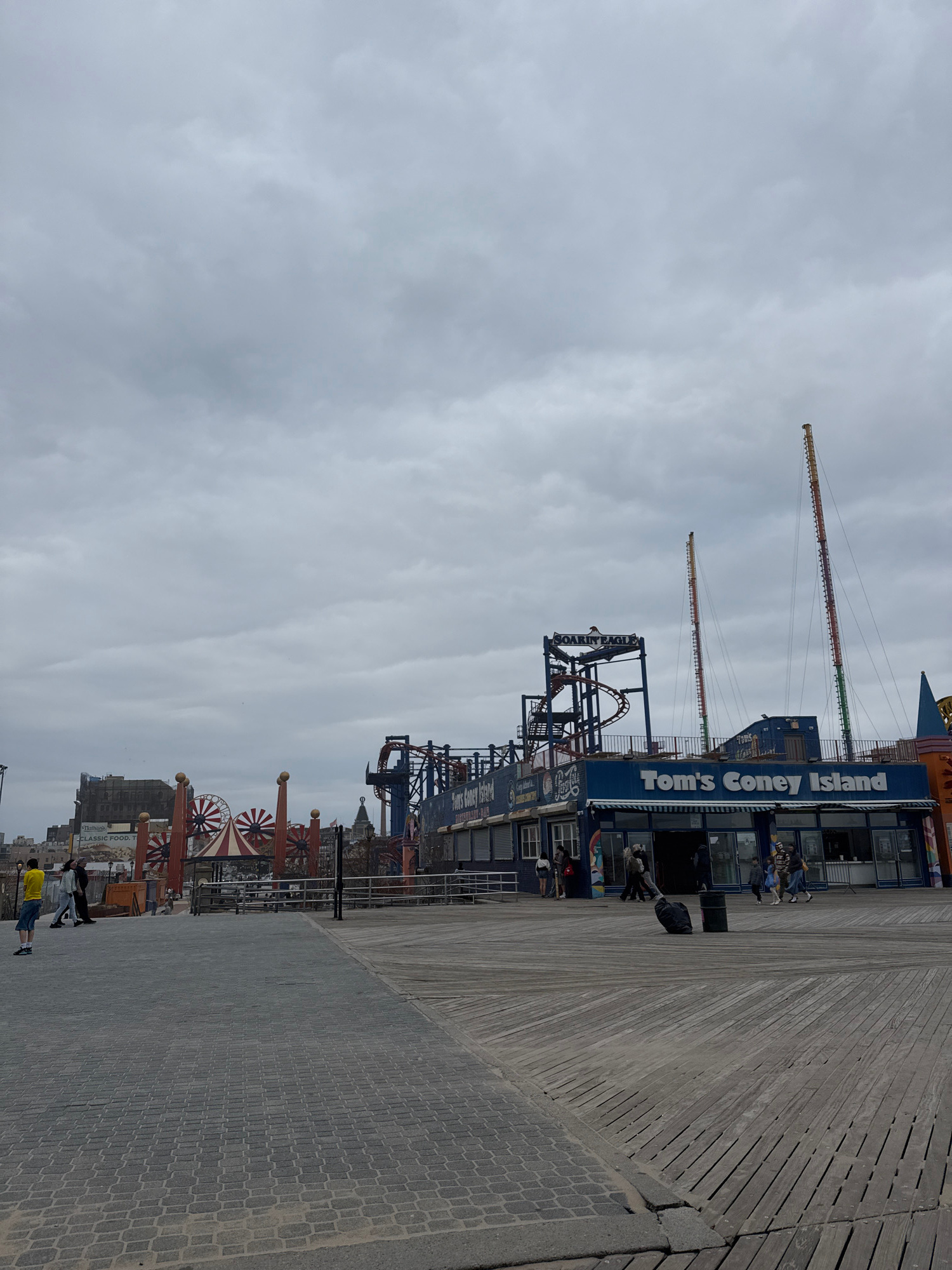 The image shows the Coney Island boardwalk in New York City, United States of America. The sky is overcast. In the background are amusement park rides, including a roller coaster, tall drop towers, an…read more