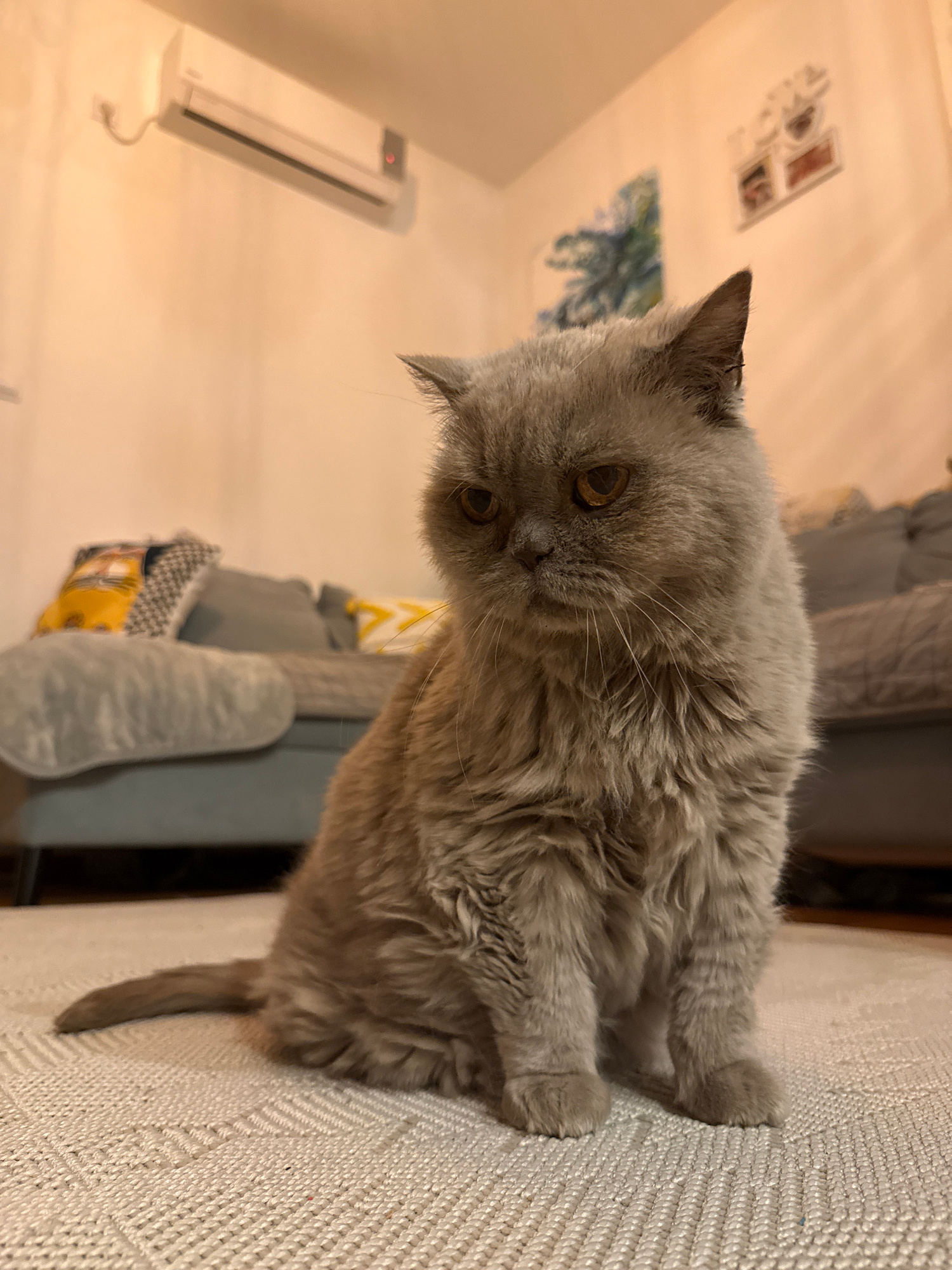 A grey British Shorthair cat is sitting on a beige textured sofa. The cat is facing the camera with its head slightly tilted. The background includes a couch, a wall with pictures, and an air conditio…read more