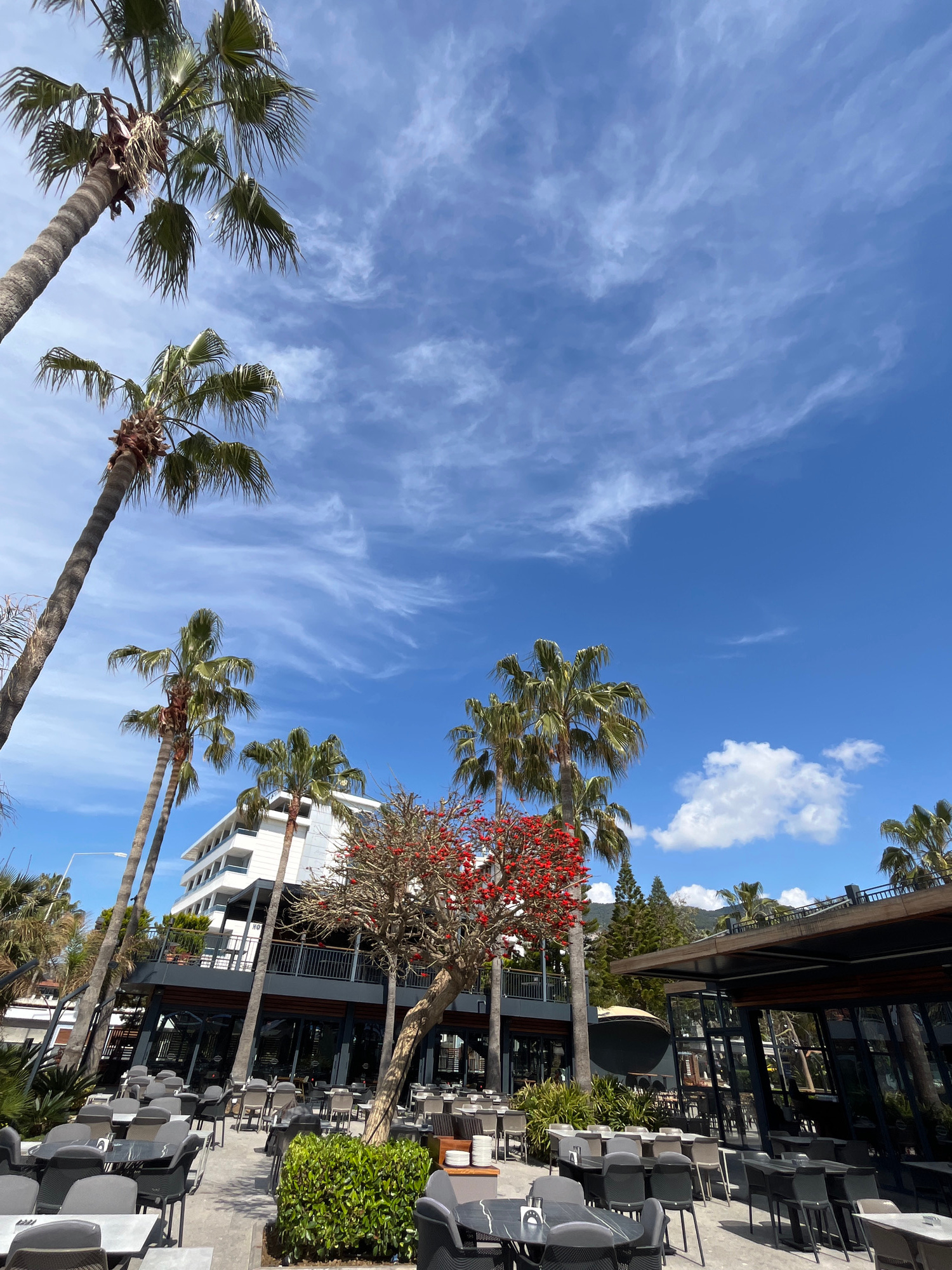 The image shows an outdoor setting with palm trees under a blue sky dotted with light, wispy clouds, in Alanya, Turkey. The trunks of several palm trees are visible from bottom left, rising upwards to…read more