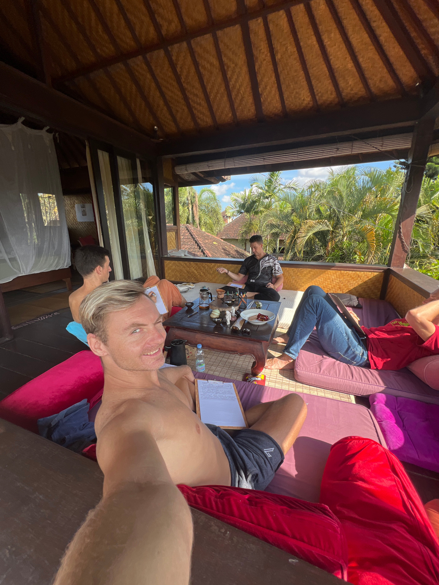 The image shows a group of people relaxing and enjoying themselves in what appears to be a partially covered patio or outdoor living space. The location is suggested to be in Ubud, Indonesia, based on…read more