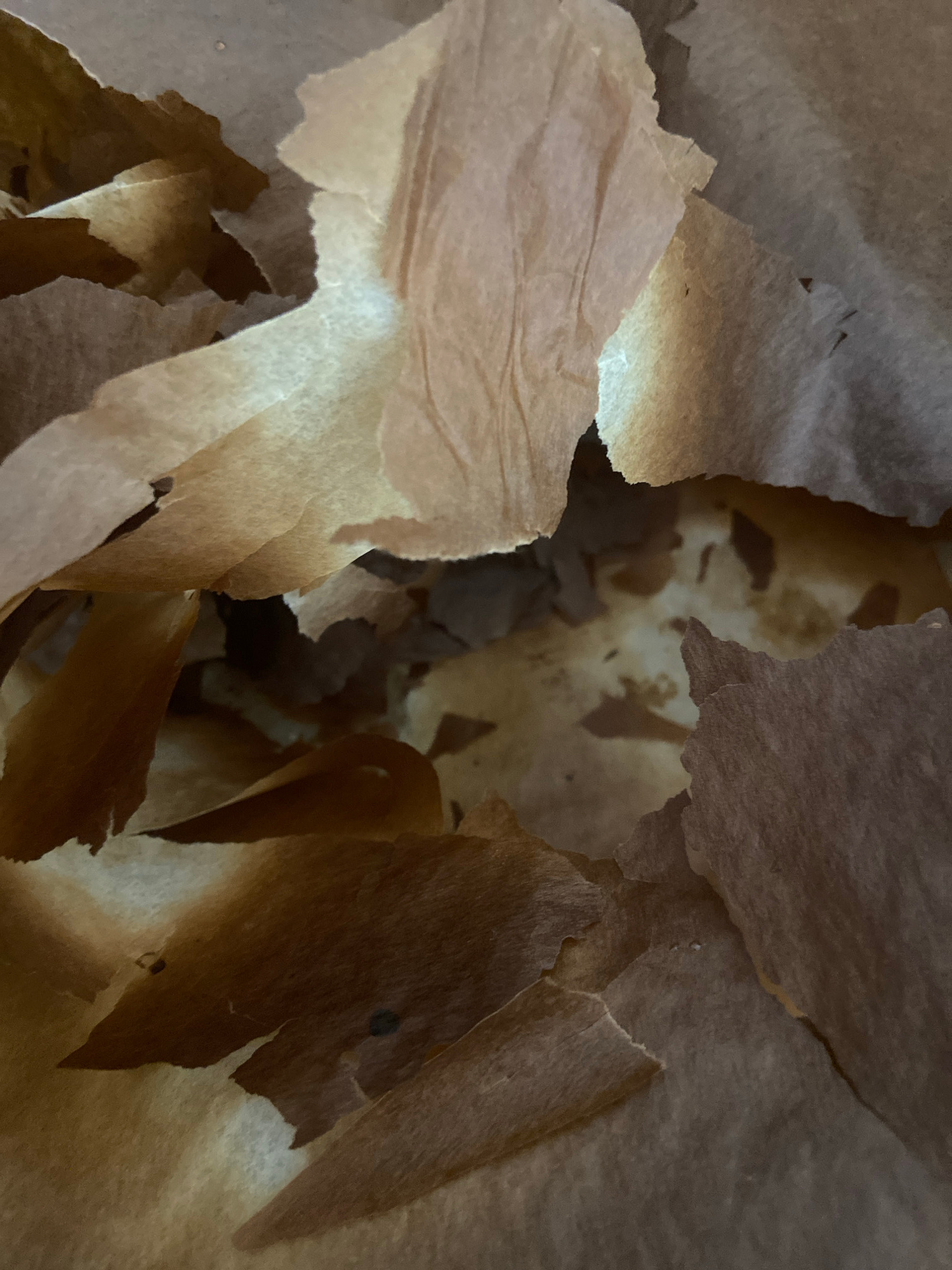 The image shows the inside of a brown paper bag. Fragments of the bag have been torn away, revealing the interior. The background is blurred and out of focus. There is no discernible information relat…read more