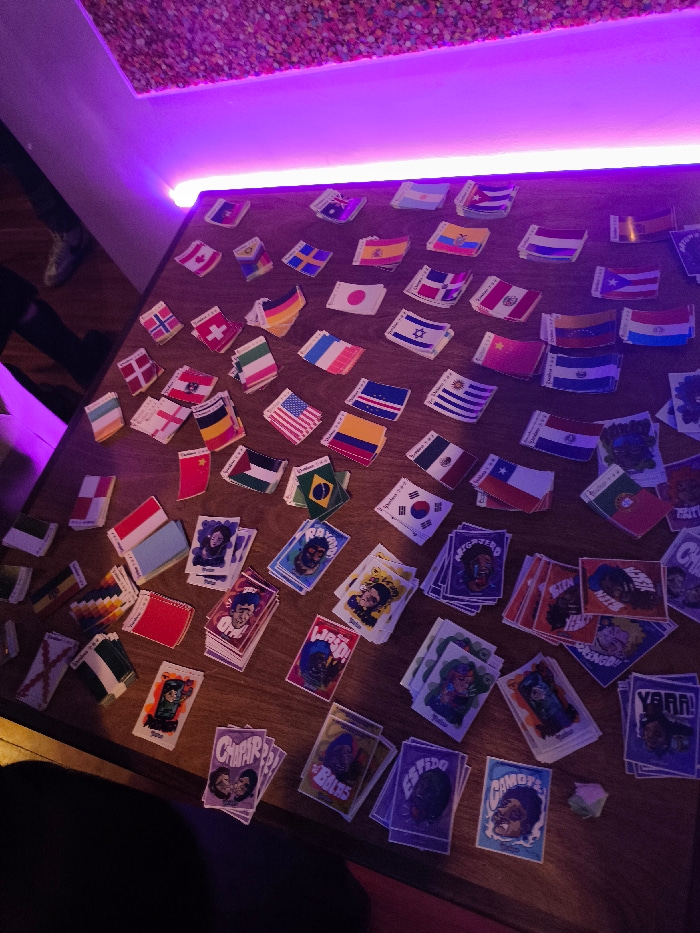 The image depicts an indoor scene in La Paz, Bolivia, featuring a light-brown wooden tabletop illuminated by purple LED strip lighting mounted on an adjacent wall. Above the LED strip, a textured ceil…read more