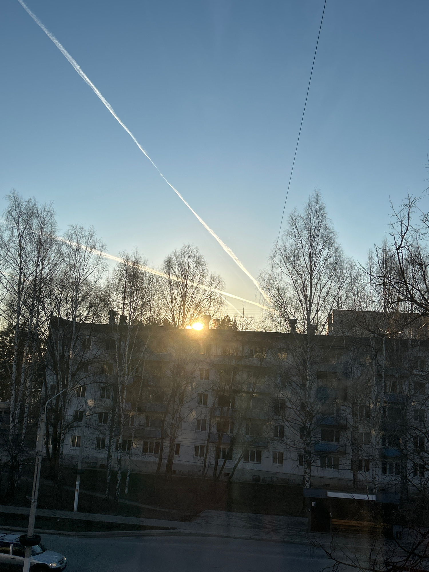 The image shows an urban landscape in Chaikovsky, Russia at what appears to be dawn or dusk. The sky is light blue with visible contrails from aircraft. An apartment building stands to the right of th…read more