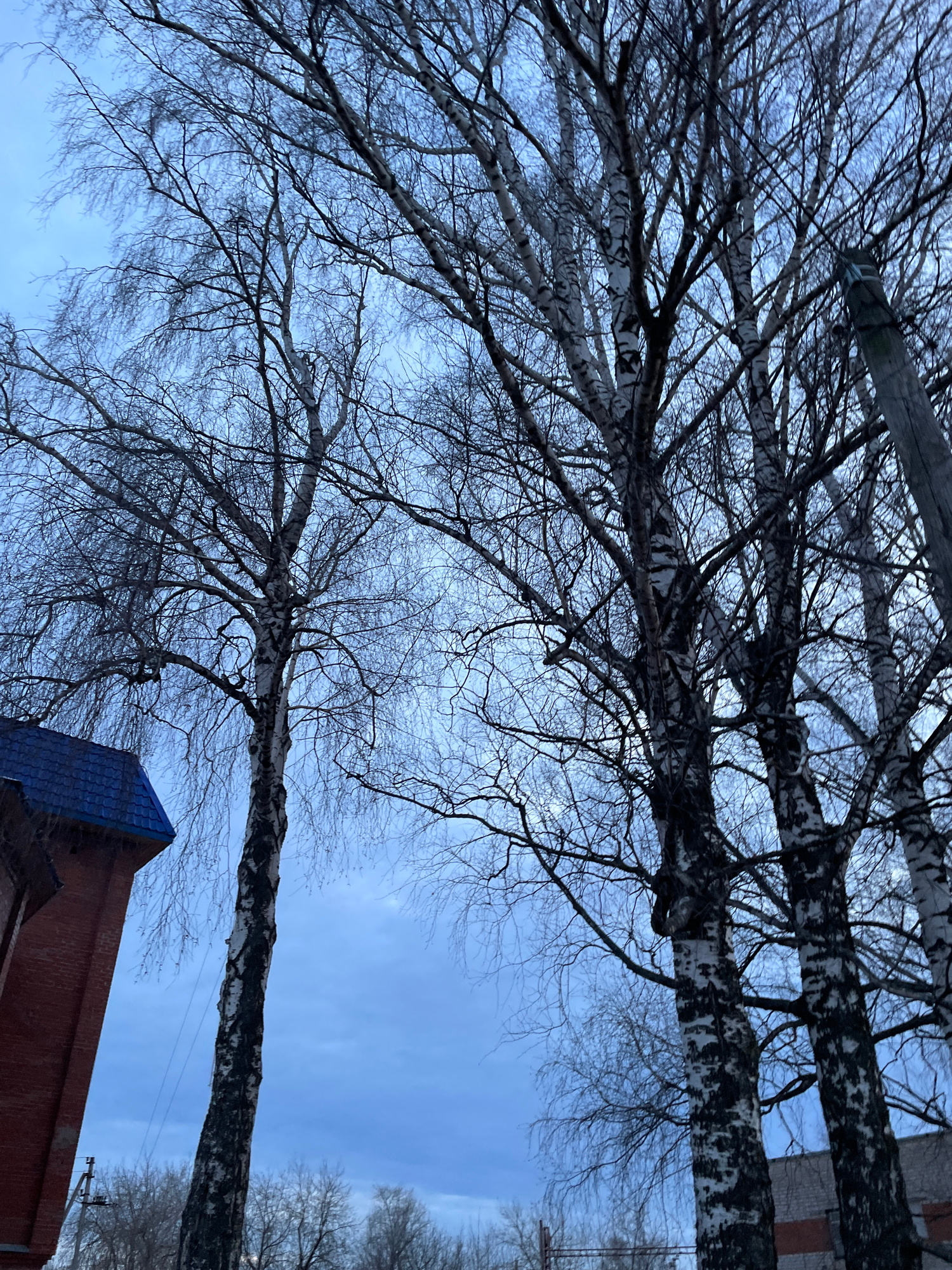 The image depicts a view looking up at the sky through the bare branches of birch trees. The trees have white bark with black markings, typical of birch trees. The sky is a pale blue. In the lower por…read more