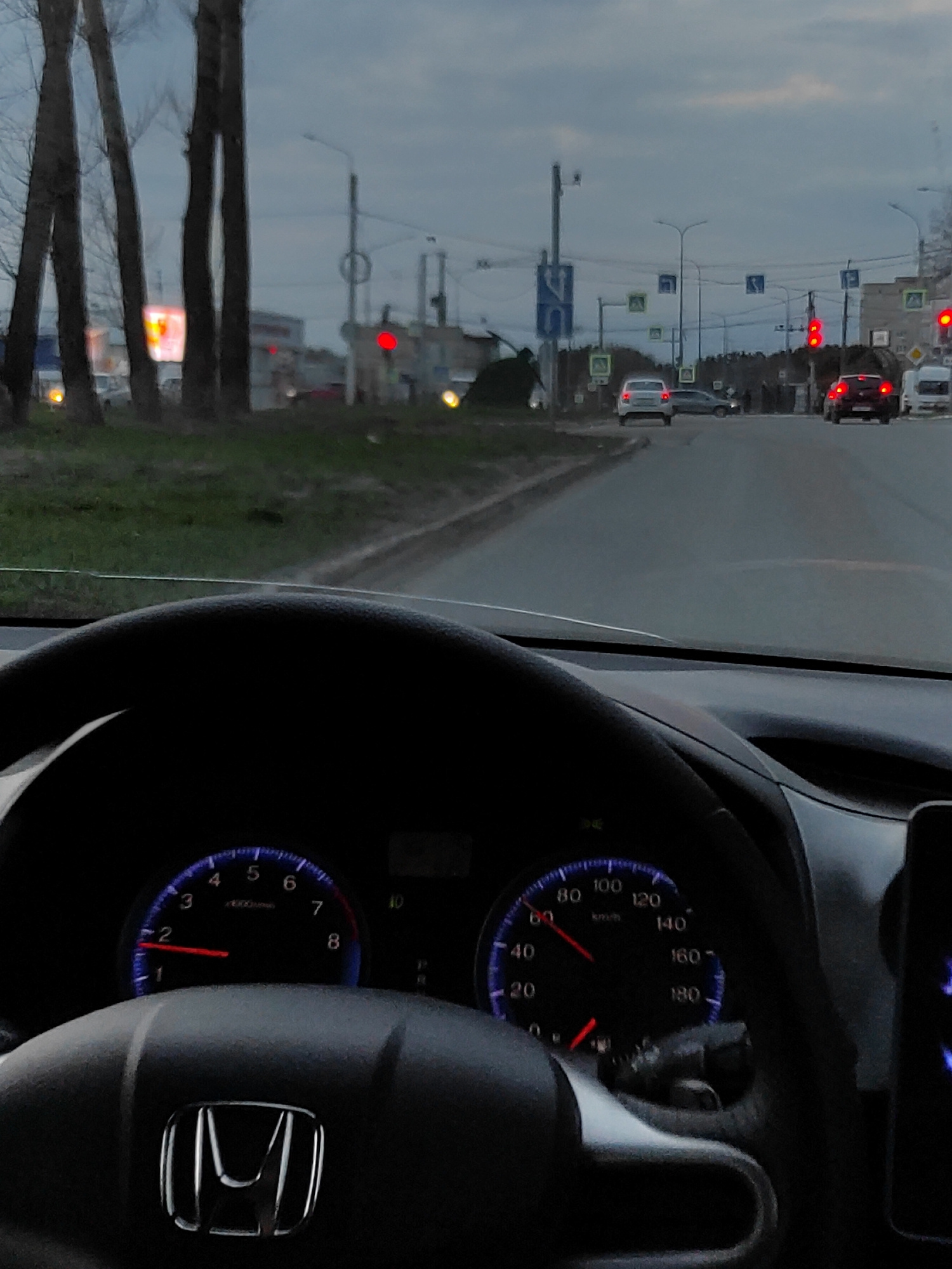 The image captures a driver's view from inside a stationary car, looking out onto a road in Chaikovsky, Russia, during what appears to be dusk or early evening under an overcast sky. In the immediate…read more