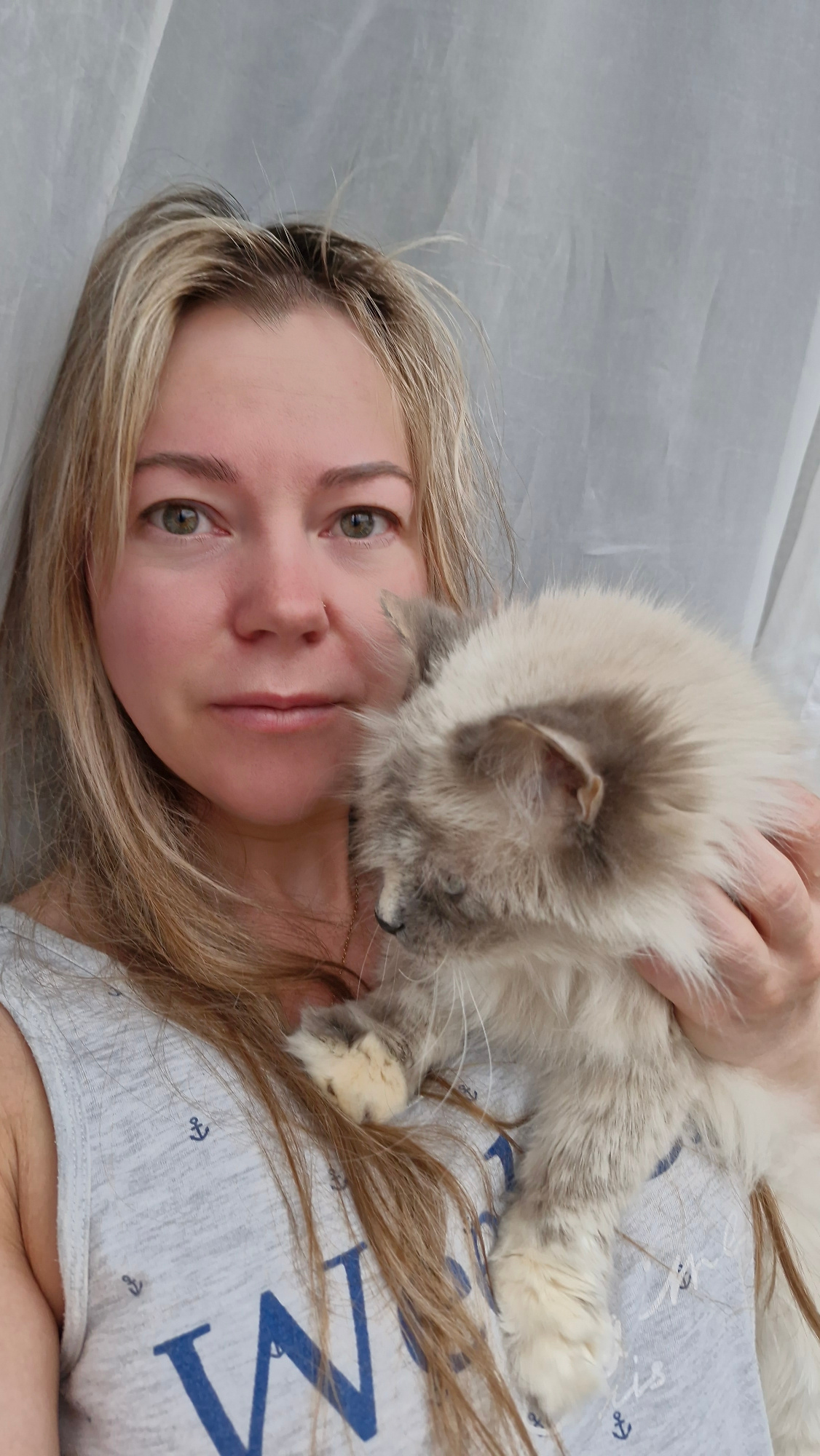 A light-skinned woman with light brown and blonde hair is lying on a white surface. A fluffy, light gray and white cat is on her chest. The woman is wearing a light gray shirt with a blue 'M' and anchβ¦read more