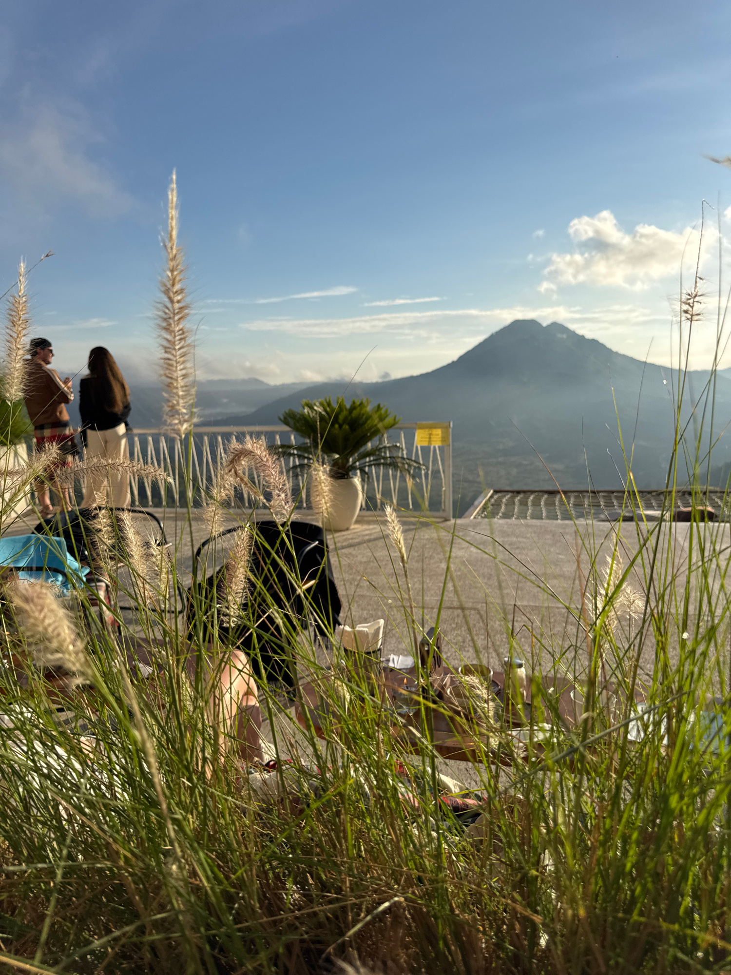 The image shows a landscape in Kedisan, Indonesia, featuring a mountain in the background under a partly cloudy sky. In the foreground, there is tall grass with seed heads obscuring some of the scene.…read more