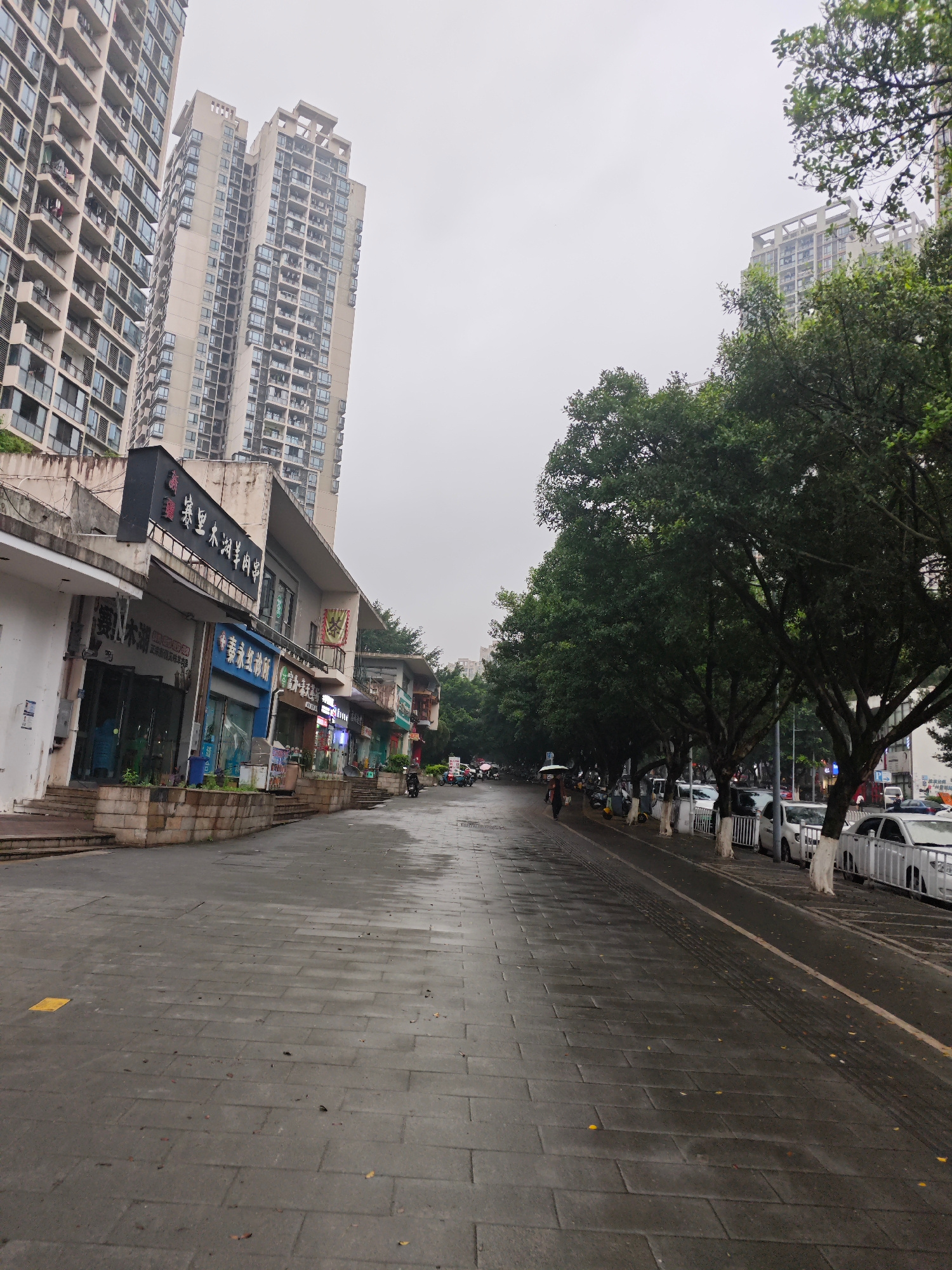 The photograph depicts a street scene in Chongqing High-tech Zone, China. It is a cloudy day, and the pavement appears wet. Tall residential buildings dominate the left side of the frame. Adjacent to…read more