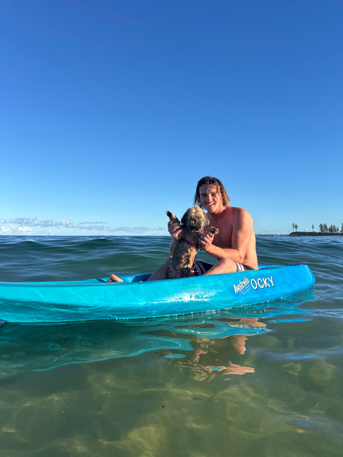 A male individual and a small, shaggy-haired dog are situated in a light blue "Australis OCKY" sit-on-top kayak on the water near Bulli, Australia. The man, with wet, light brown hair and bare-chested…read more