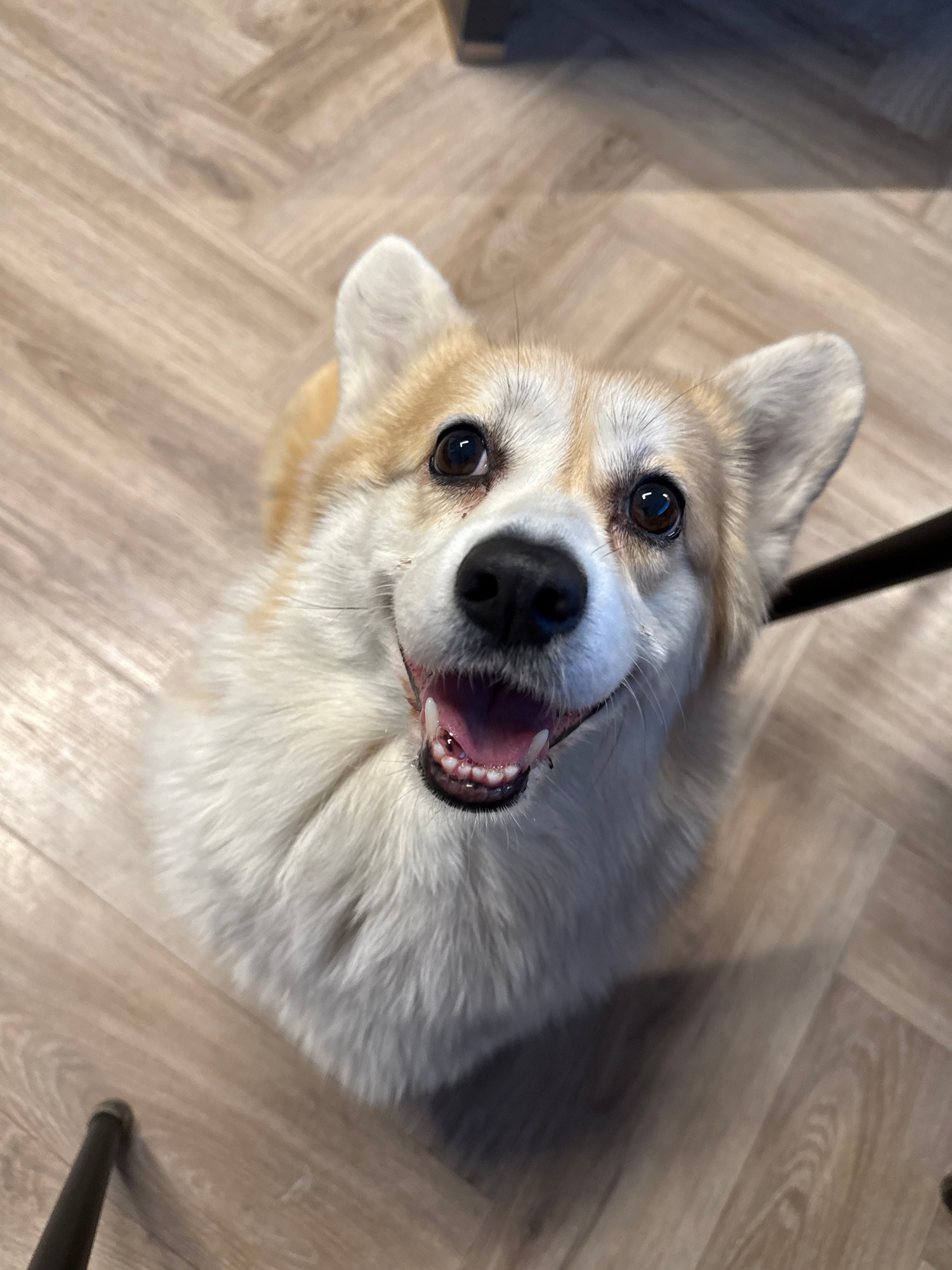 A close-up, high-angle photograph shows a smiling corgi dog looking up at the camera. The dog has white and tan fur, dark eyes, and a black nose. Its mouth is open, revealing teeth. The background is…read more