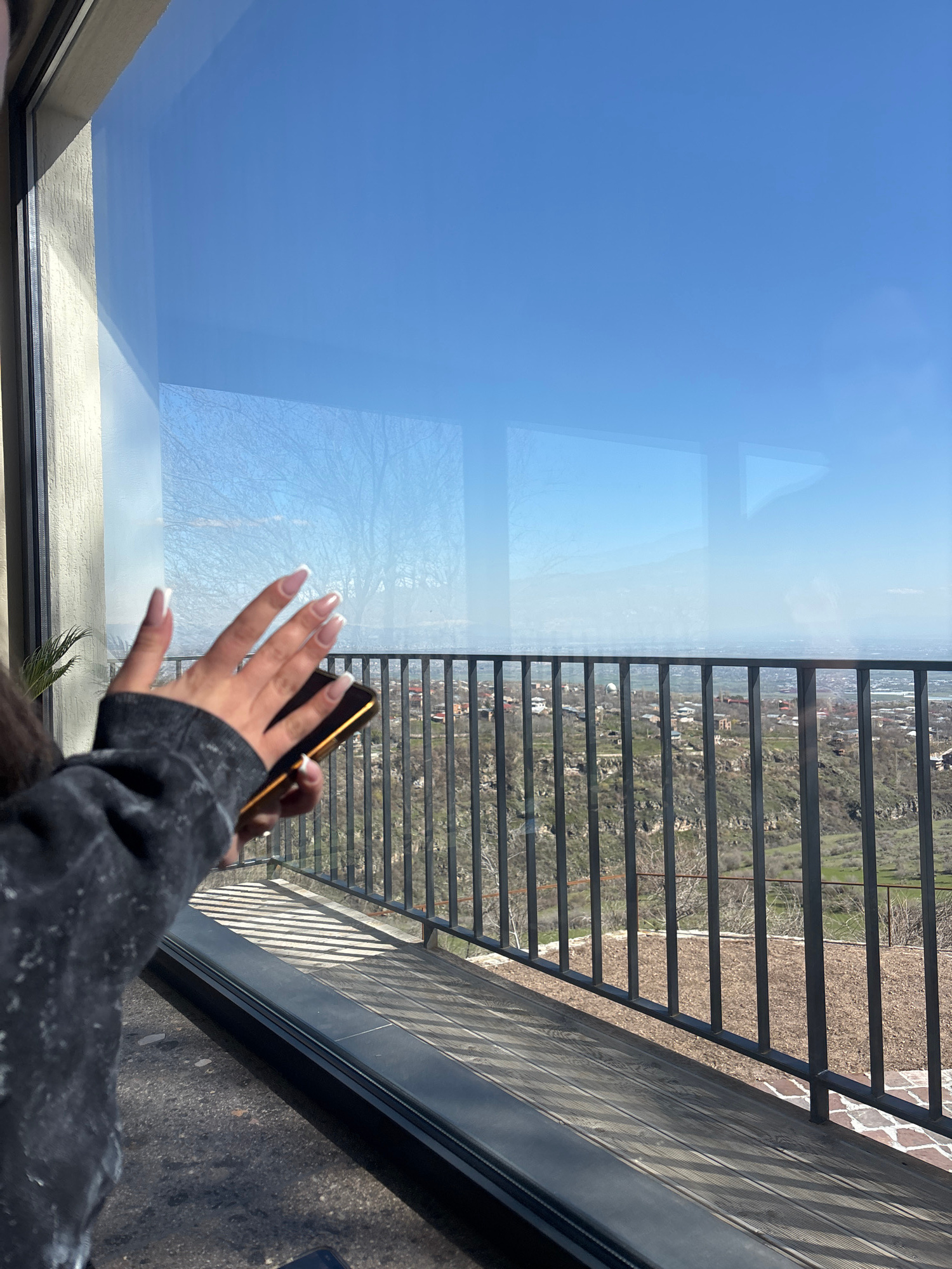 The image captures a first-person perspective view from an elevated position, likely a balcony or viewing platform, overlooking a landscape in Orgov, Armenia. In the foreground, a person's right hand…read more