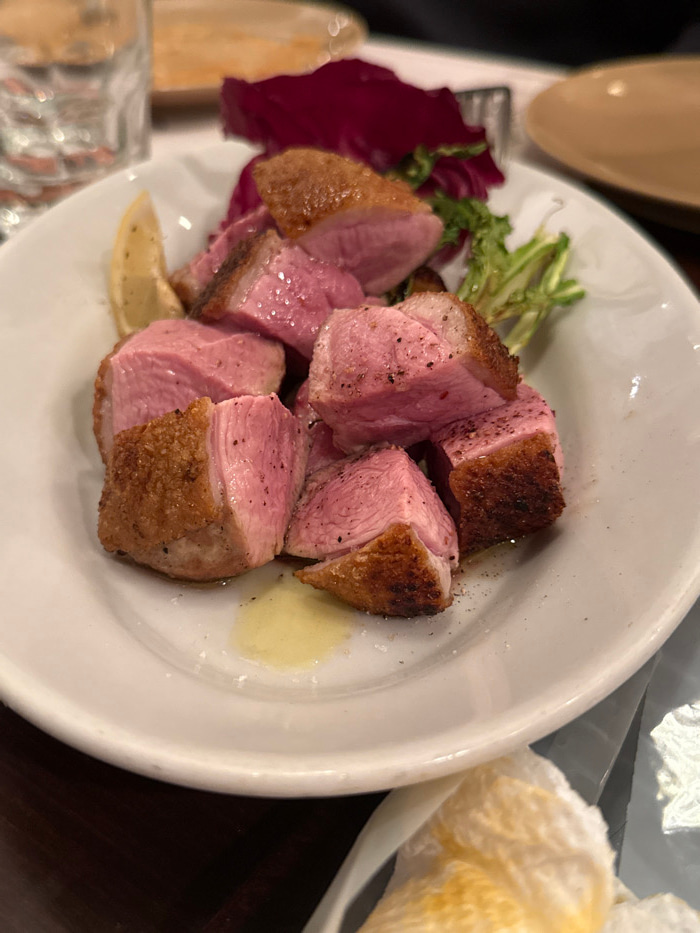 This image depicts a close-up, elevated view of a prepared food dish presented on a white oval or round plate, located within a dining establishment in Setagaya, Japan. The plate holds approximately ten irregular cubes of seared meat, consistent with duck breast, characterized by a browned, crispy skin layer and a pink, medium-rare interior. Each meat piece is visibly seasoned with dark specks resembling cracked black pepper. A small accumulation of clear, light-yellow liquid (likely rendered fat or oil) is present on the plate's surface beneath the meat. The dish is garnished with a small portion of mixed greens, including dark red radicchio leaves and lighter green curly lettuce, along with a thin slice of lemon positioned on the left edge of the plate. In the blurred background, a clear glass tumbler is partially visible to the upper left. To the upper right, a portion of a beige ceramic plate and the prongs of a metallic fork are discernible. The immediate foreground reveals a dark brown table surface, and a crumpled, off-white paper napkin or towel, exhibiting yellowish stains, is partially visible in the lower right. No individuals are depicted. | Open Wire