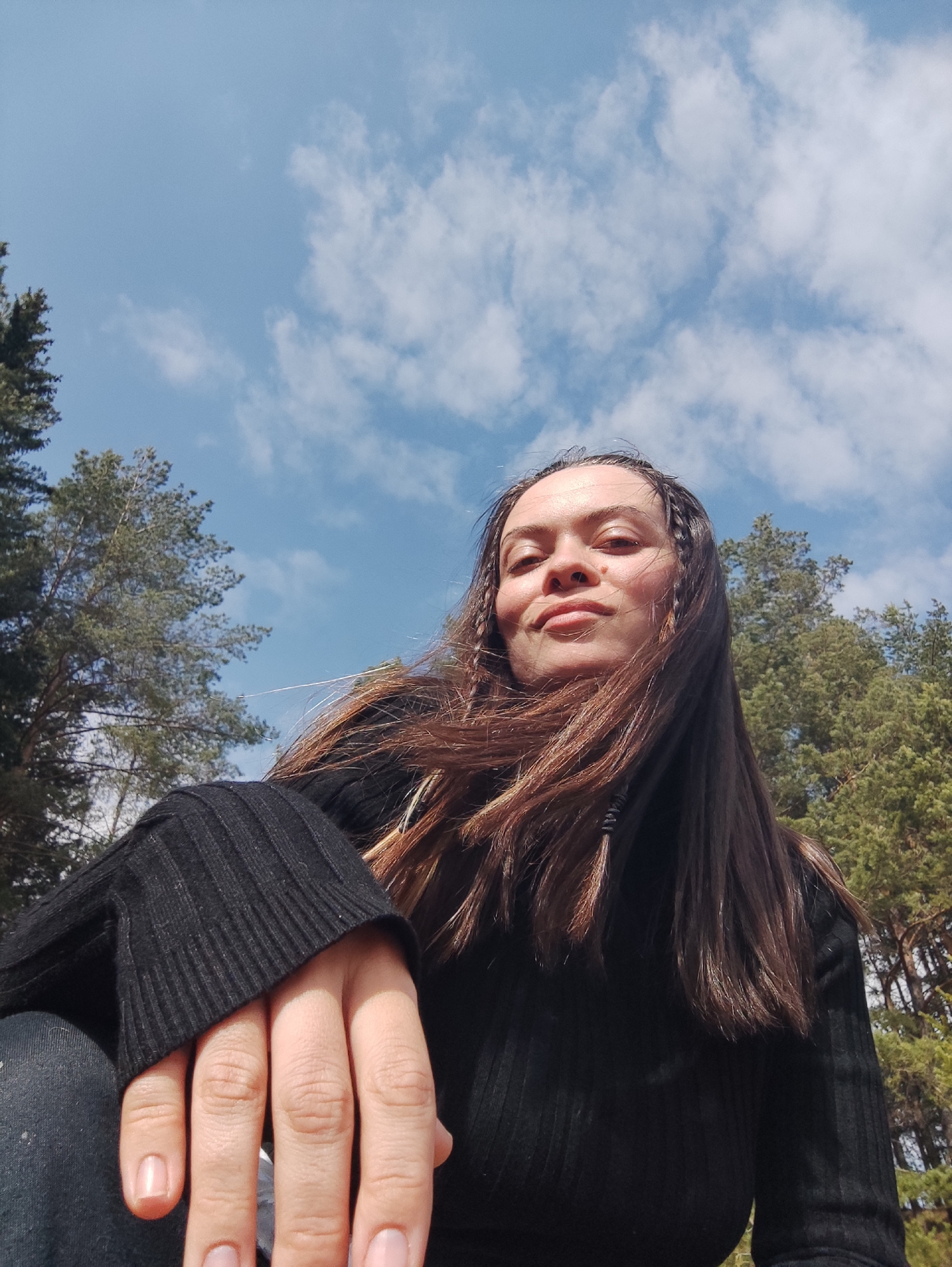 A medium shot captures a woman with long, dark brown hair, a small mole on her right cheek, and several small braids framing her face, gazing downwards at the camera with a slight smile. She is wearin…read more