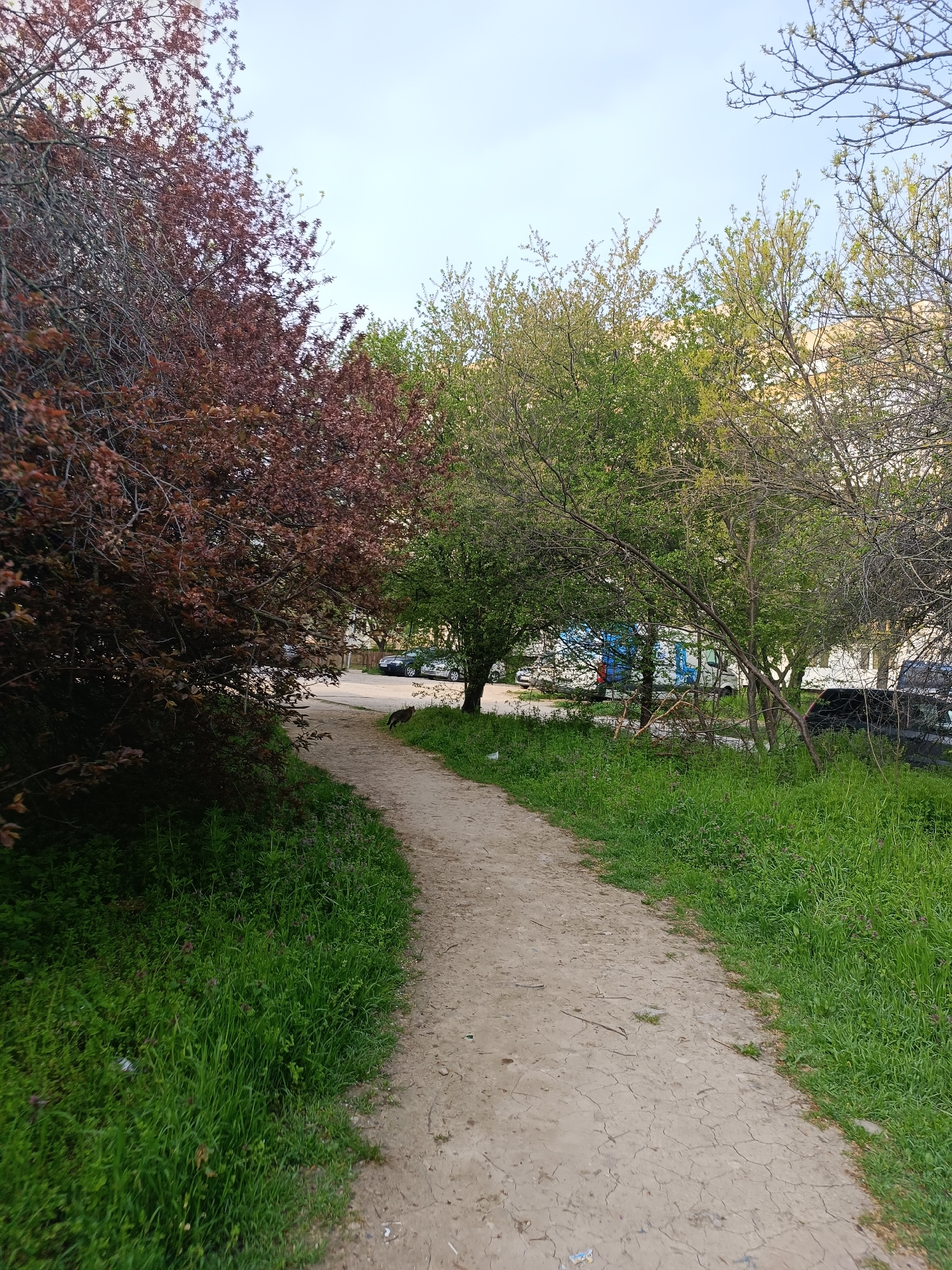 A ground-level, outdoor shot depicts a dirt path winding between trees in Pleven, Bulgaria. The path is dry and cracked, bordered by green grass on both sides. To the left of the path is a large tree…read more