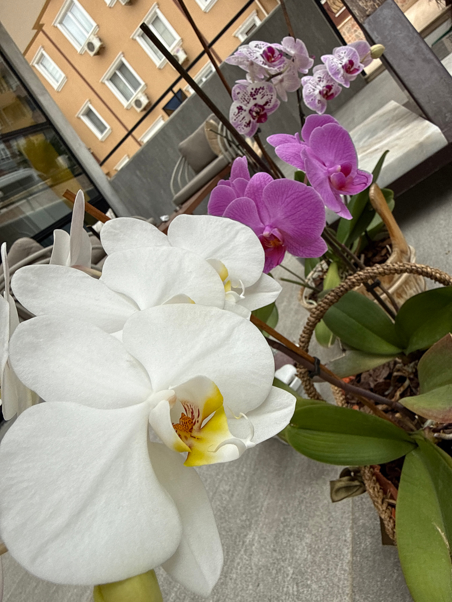 The scene depicts a collection of potted orchids situated on a balcony or terrace, with an urban background in Alanya, Turkey. In the immediate foreground and left, several large white Phalaenopsis or…read more