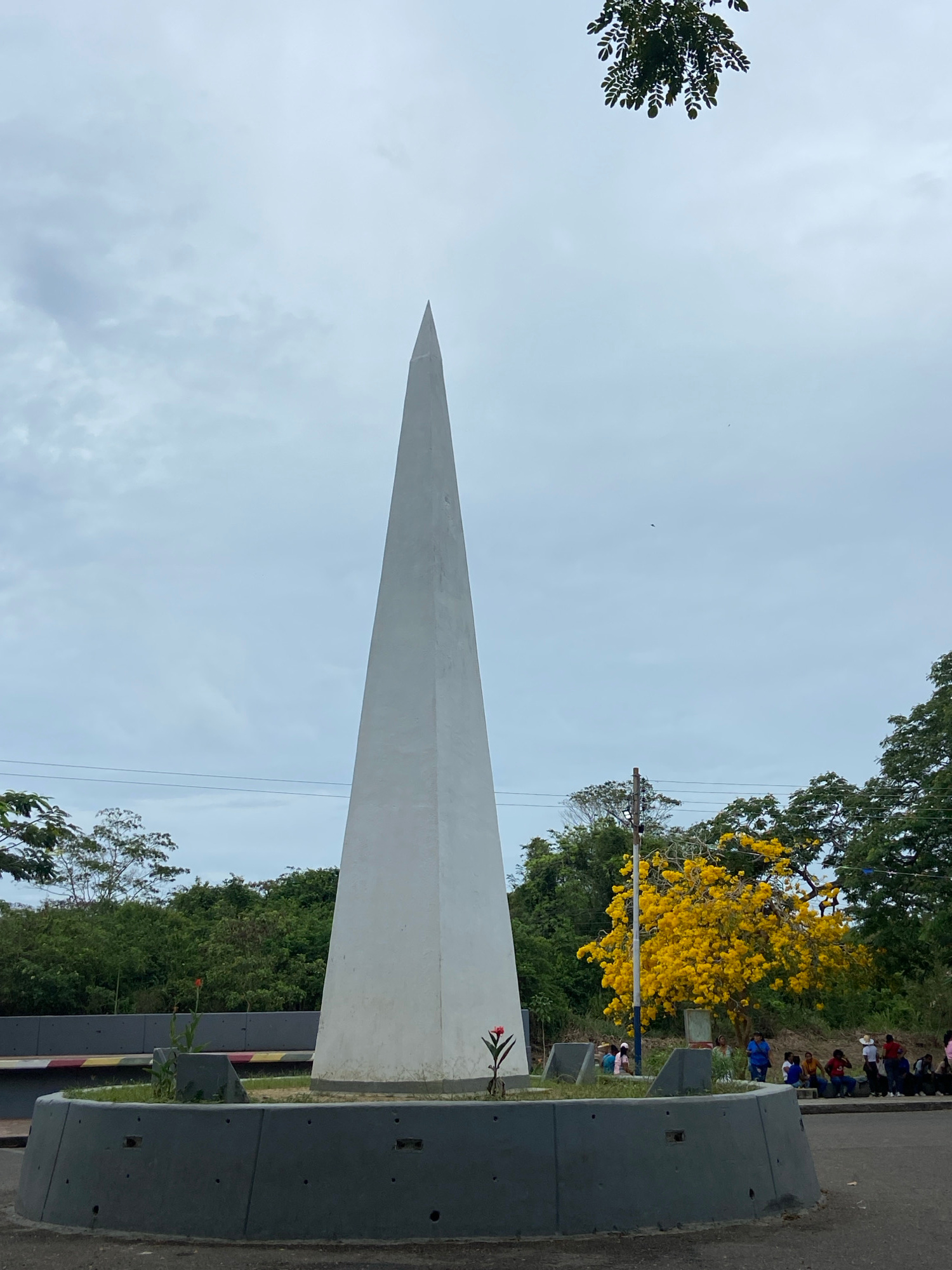 A vertical, low-angle shot shows a tall, pointed white monument against a cloudy sky. To the right of the monument are trees, some with bright yellow flowers. A concrete barrier runs along the right s…read more
