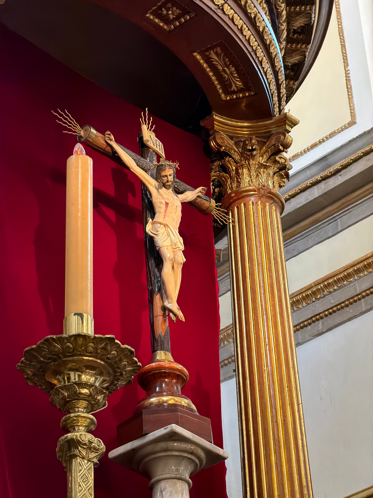 The image captures a view inside a church, likely in Puebla, Mexico, evidenced by the architectural details and religious iconography. The focal point is a crucifix with a depiction of Jesus Christ, m…read more