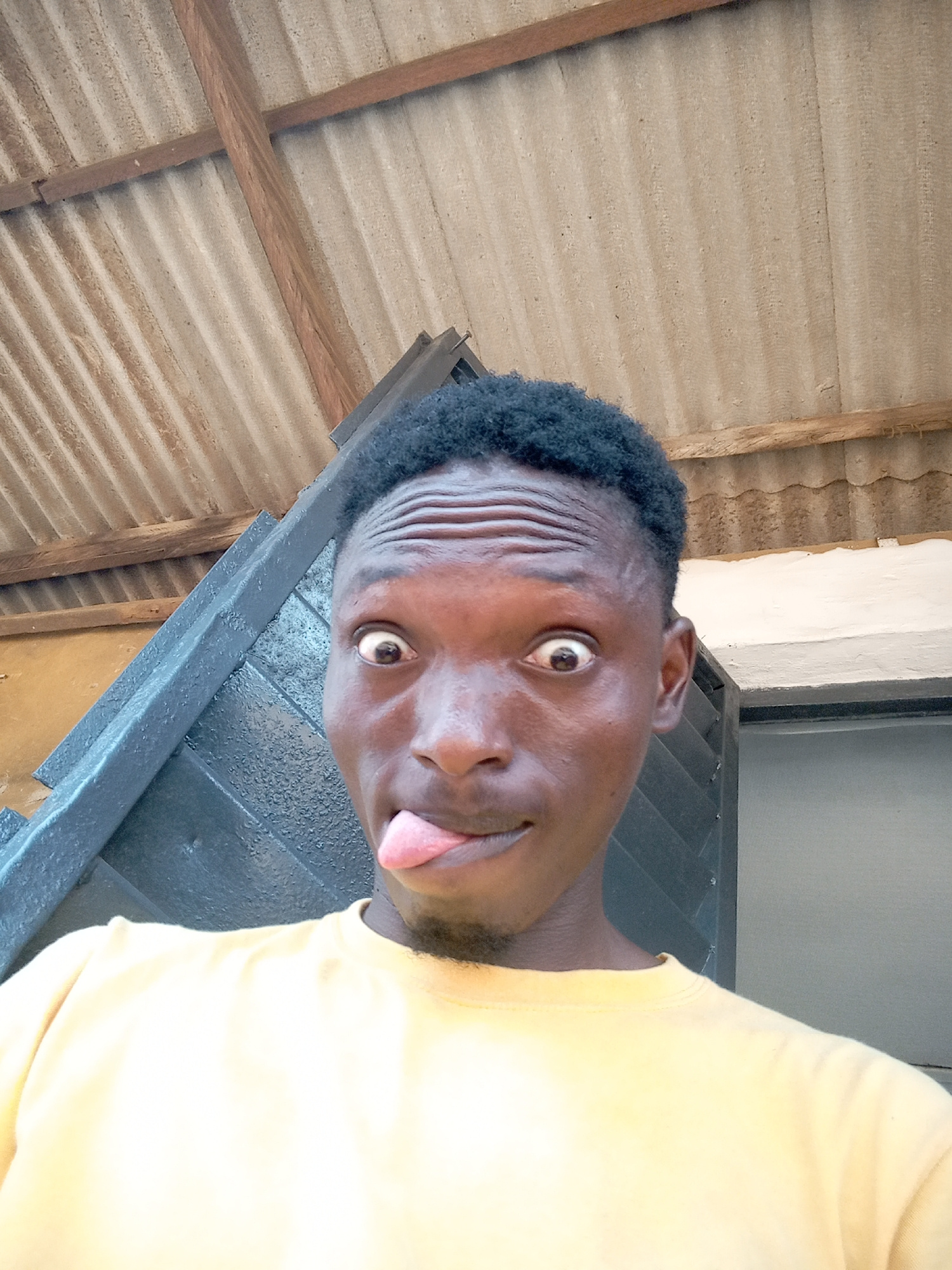 A man is depicted in a close-up, slightly upward-angled shot, appearing to take a selfie. He has dark skin, short, dark, curly hair, and is wearing a plain yellow t-shirt. His facial expression is exa…read more