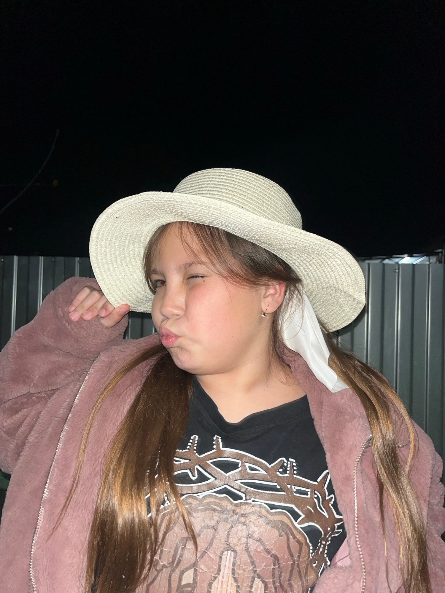 A young person is wearing a woven hat and a pink, plush jacket over a dark t-shirt with a light-colored design. The background is dark, but a building with horizontal siding is visible to the right. T…read more