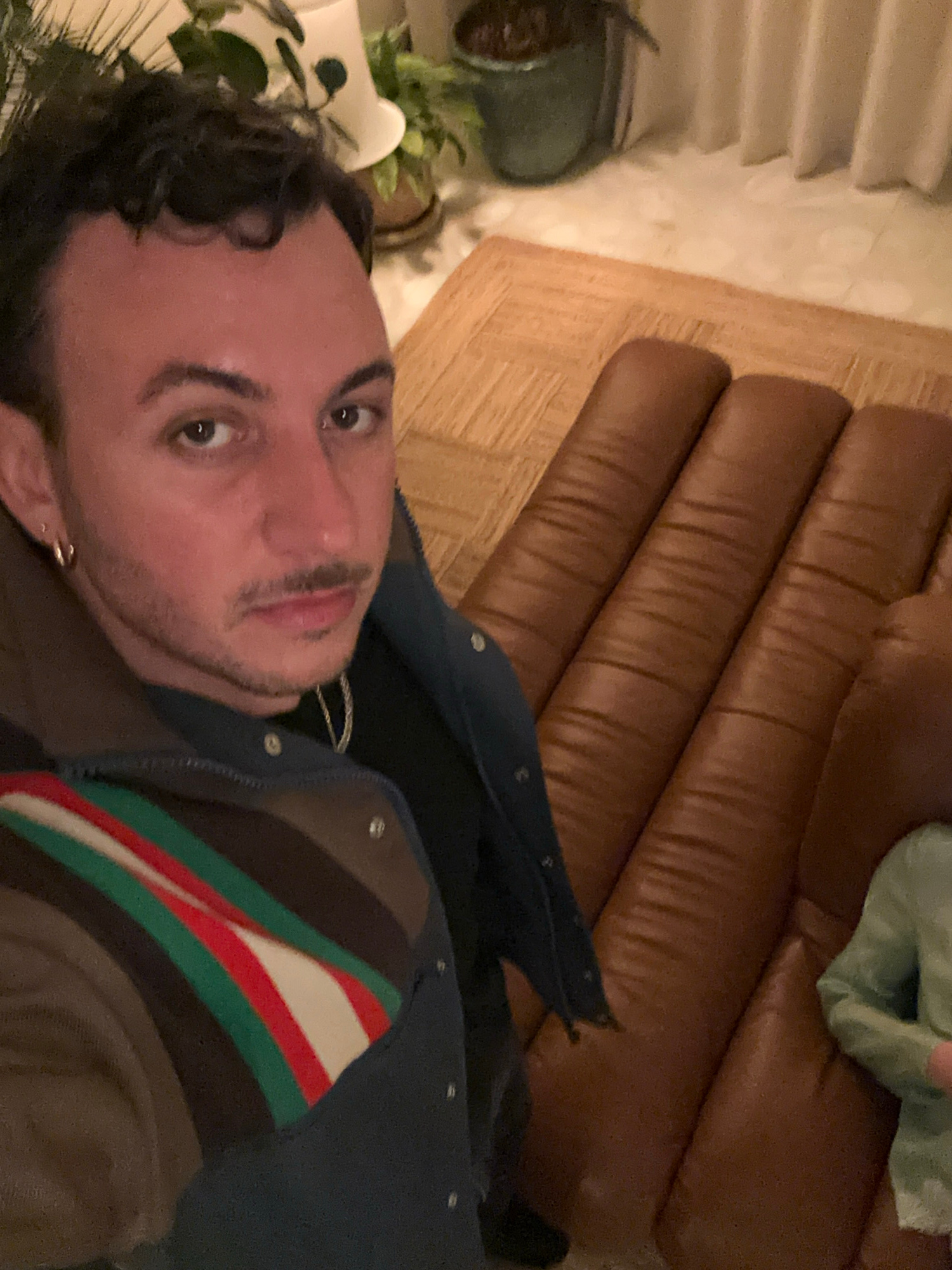 A first-person view image of a man indoors. The man has brown hair, brown eyes, and a trimmed beard. He wears a blue jacket over a brown and striped shirt. The background features a brown leather sofa…read more