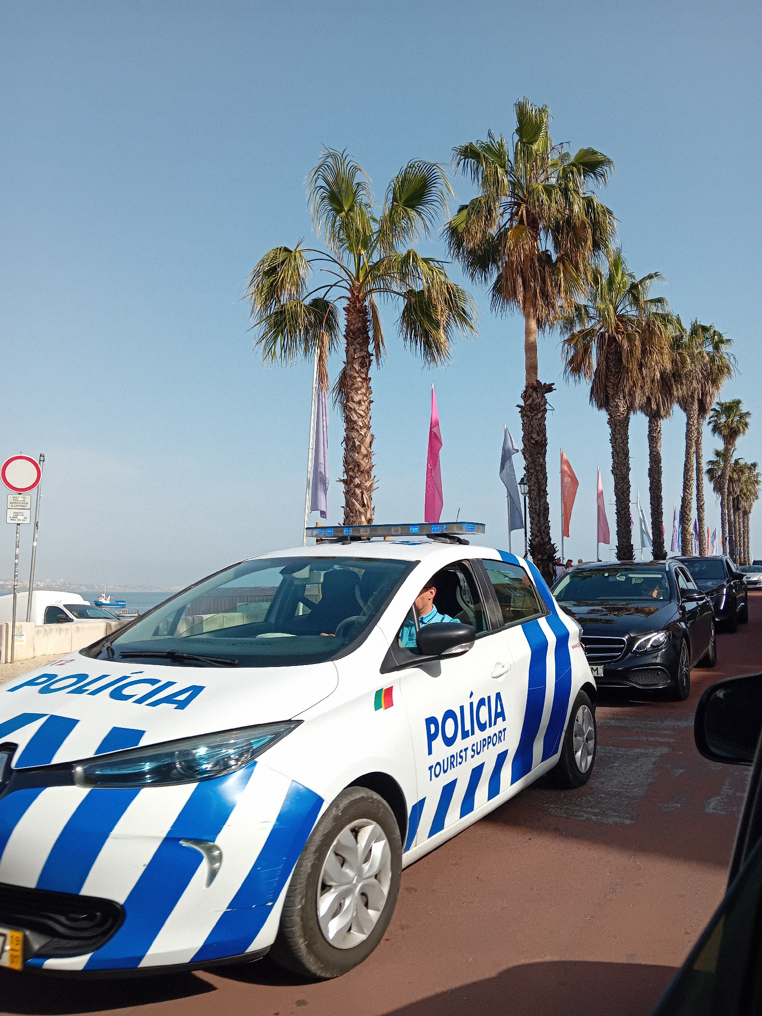 A brightly lit outdoor shot features a white and blue "POLÍCIA TOURIST SUPPORT" car, likely a police vehicle in Cascais, Portugal, parked on a sidewalk or a roadway. The car is situated parallel to a…read more