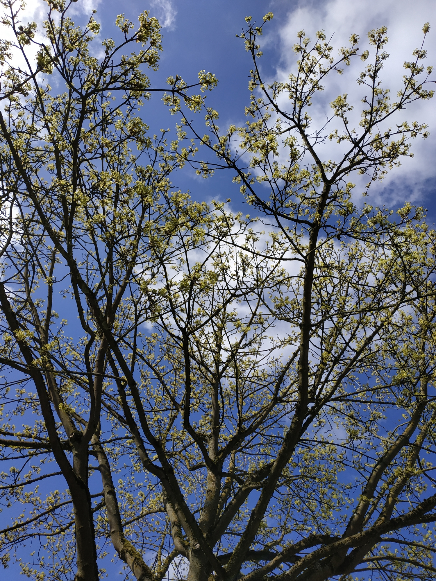 The image shows a view looking up into the canopy of a tree with emerging spring blossoms. The branches are silhouetted against a blue sky dotted with white, puffy clouds. The blossoms appear as small…read more