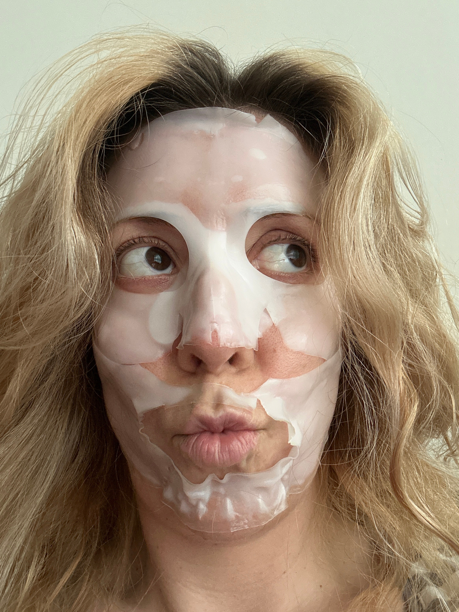 A woman with blonde hair and a face mask is shown in a close-up, angled shot. The face mask covers most of her face, with cutouts for her eyes. Her lips are pursed. The background is a light, neutral…read more