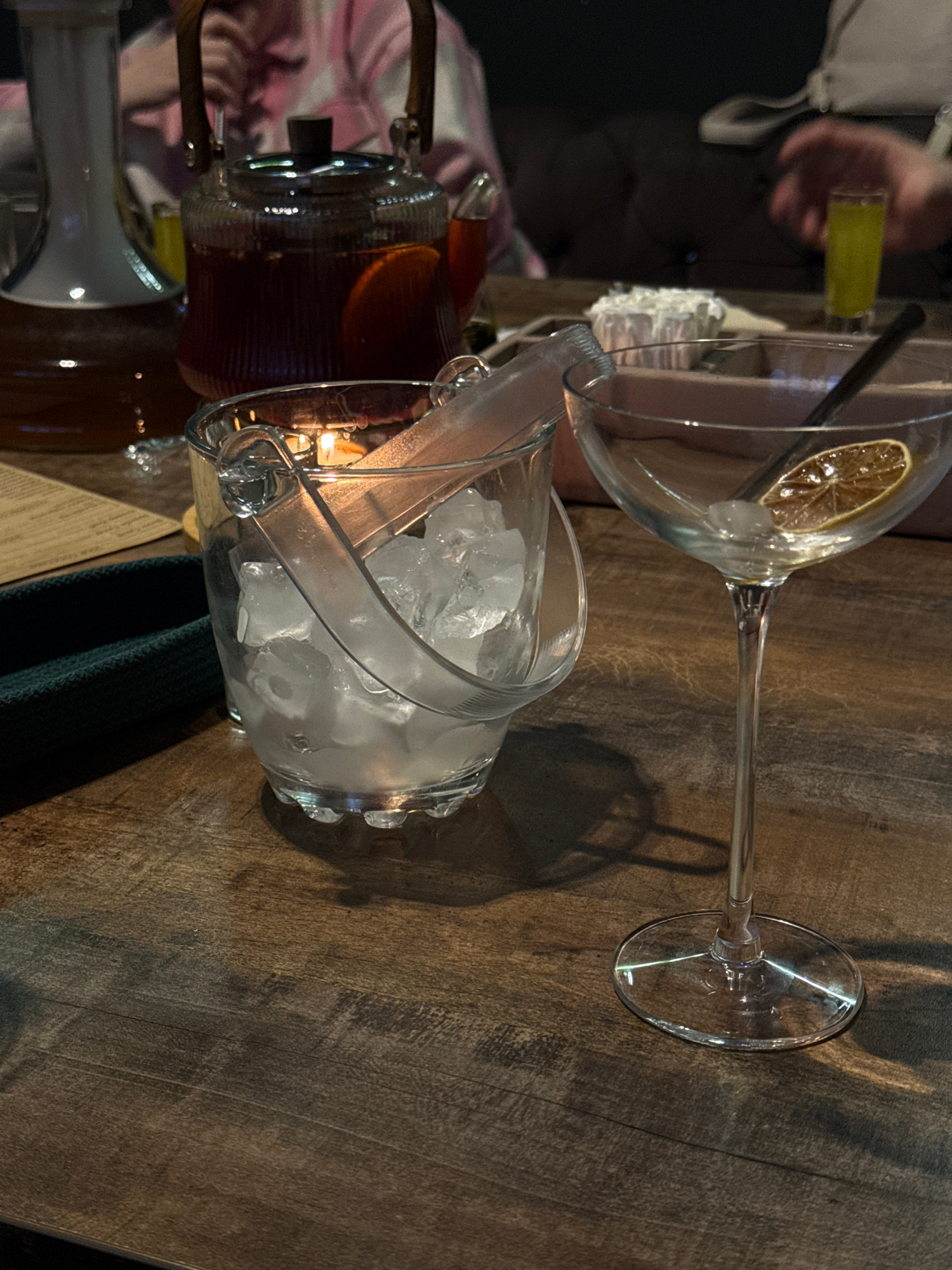 The image captures a table setting, likely in a bar or restaurant. The table has a wooden surface. There is a tall glass with a sliced lemon/orange garnish, a black straw, and possibly ice. An ice buc…read more