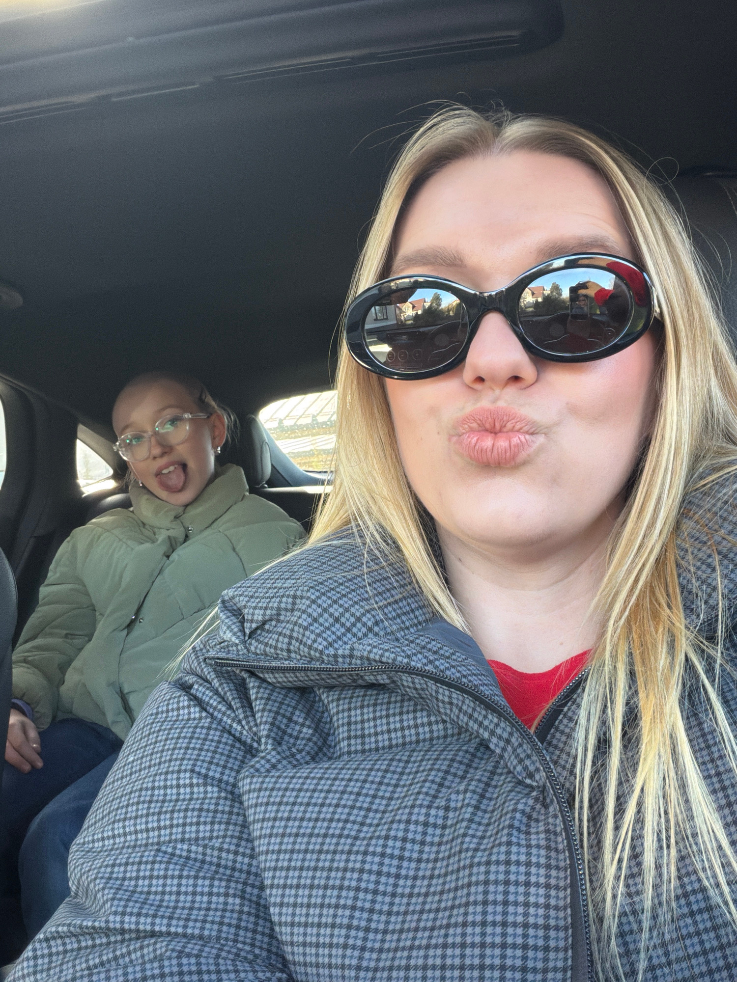A selfie photograph shows two individuals inside a vehicle. In the foreground, an adult woman is seen with blonde hair and sunglasses, making a pouting expression with her lips. She is wearing a gray…read more