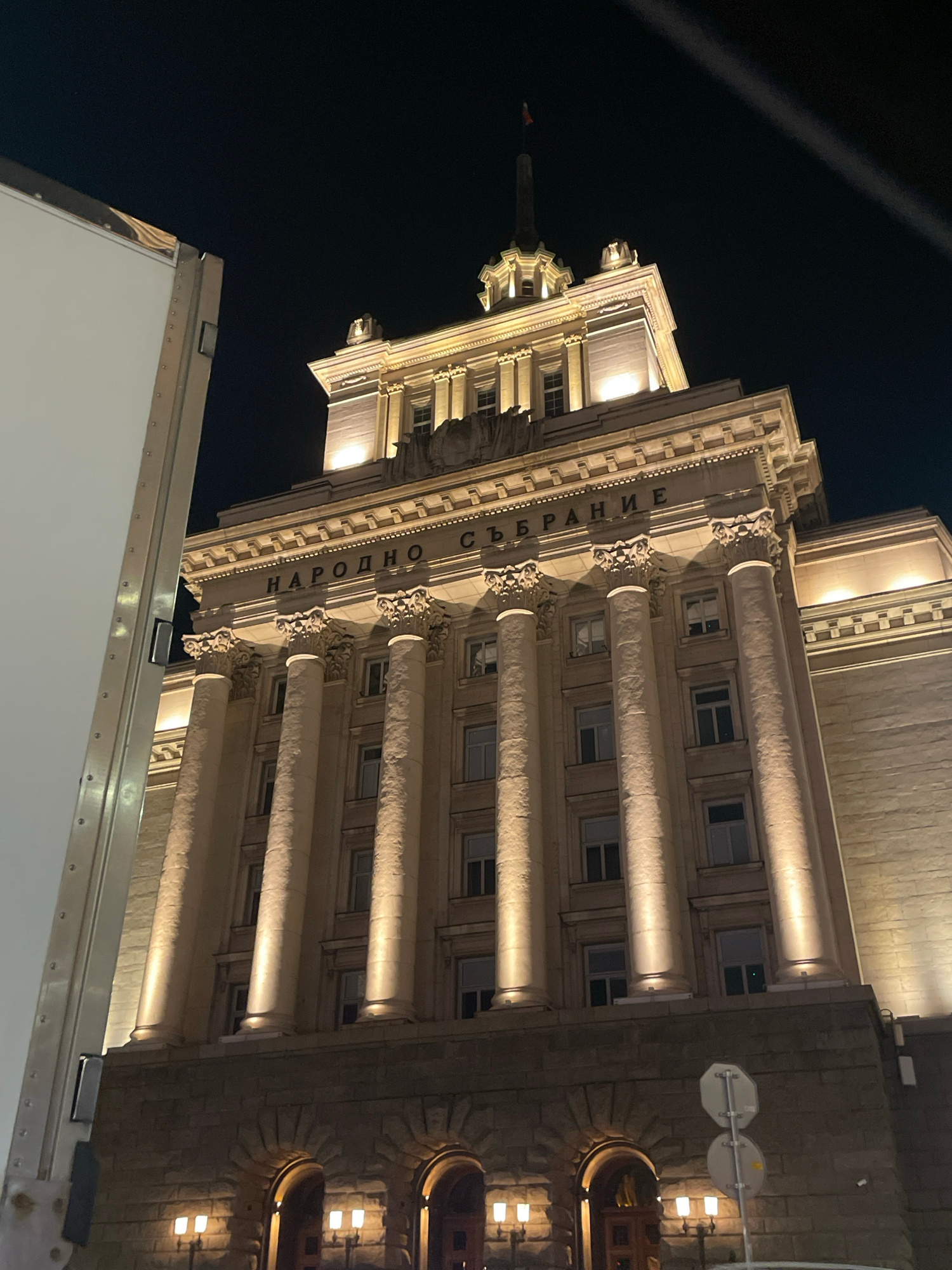 The image shows the illuminated National Assembly of Bulgaria (Народно събрание) in Sofia, Bulgaria, at night. The building is neo-Baroque in style, and its facade features rows of columns. Part of wh…read more