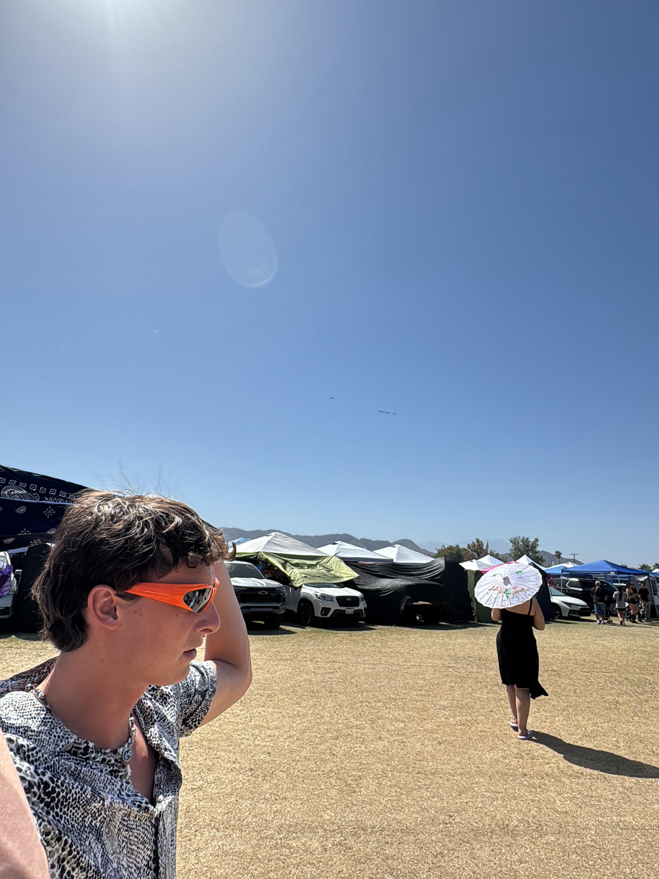 The image shows a man in orange sunglasses and a snakeskin-patterned shirt in an outdoor setting, with a woman holding a parasol walking away from the camera. Behind them are several cars parked under…read more