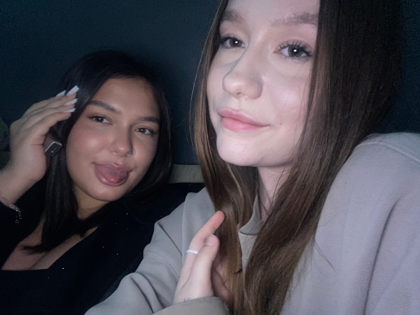 Two young women are posing for a selfie. The woman on the left has long brown hair and is wearing a light-colored sweatshirt. The woman on the right has dark hair and is wearing a dark top. She is sti…read more
