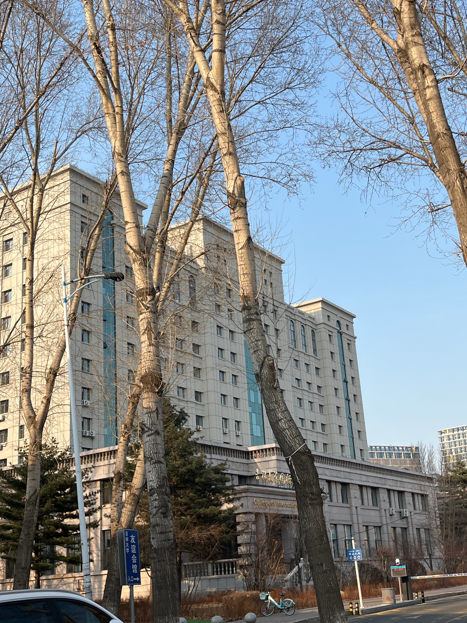 The image displays the College of International building and an associated Friendship Hotel/Guesthouse on the campus of Jilin University in Changchun City, China. The multi-story edifice features a li…read more