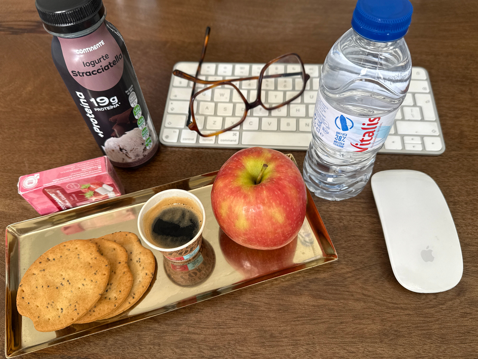 A desk in Torres Vedras, Portugal, holds a spread of items. At the top left sits a "Continente" yogurt drink with "Stracciatella" flavor, labeled with "+Proteina" and "19g Proteina". Next to it is a p…read more
