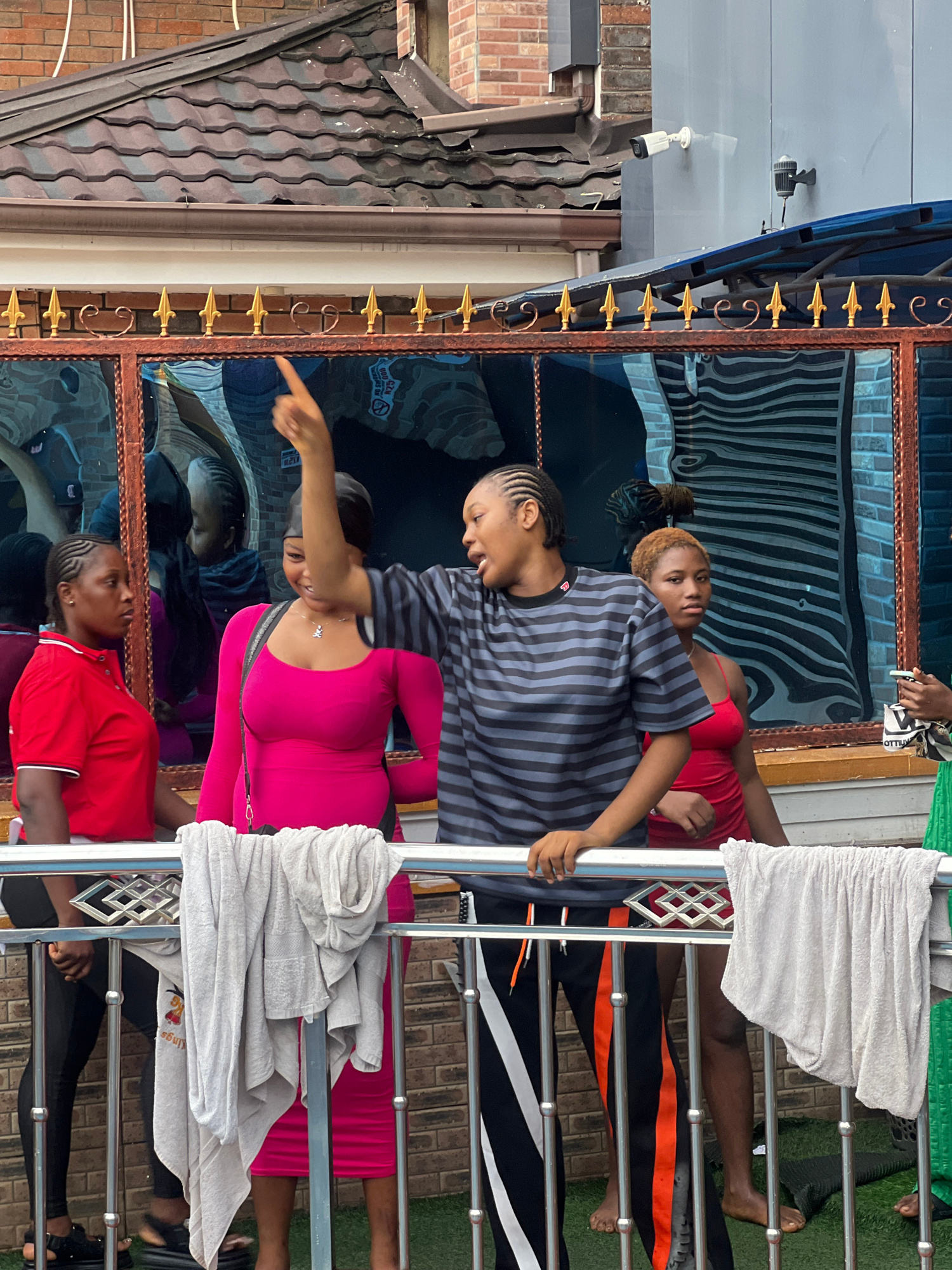 The image shows a group of people, mostly women, standing near a wrought-iron fence in what appears to be Obosi, Nigeria. The presence of a building with security cameras and a wrought-iron fence areβ¦read more