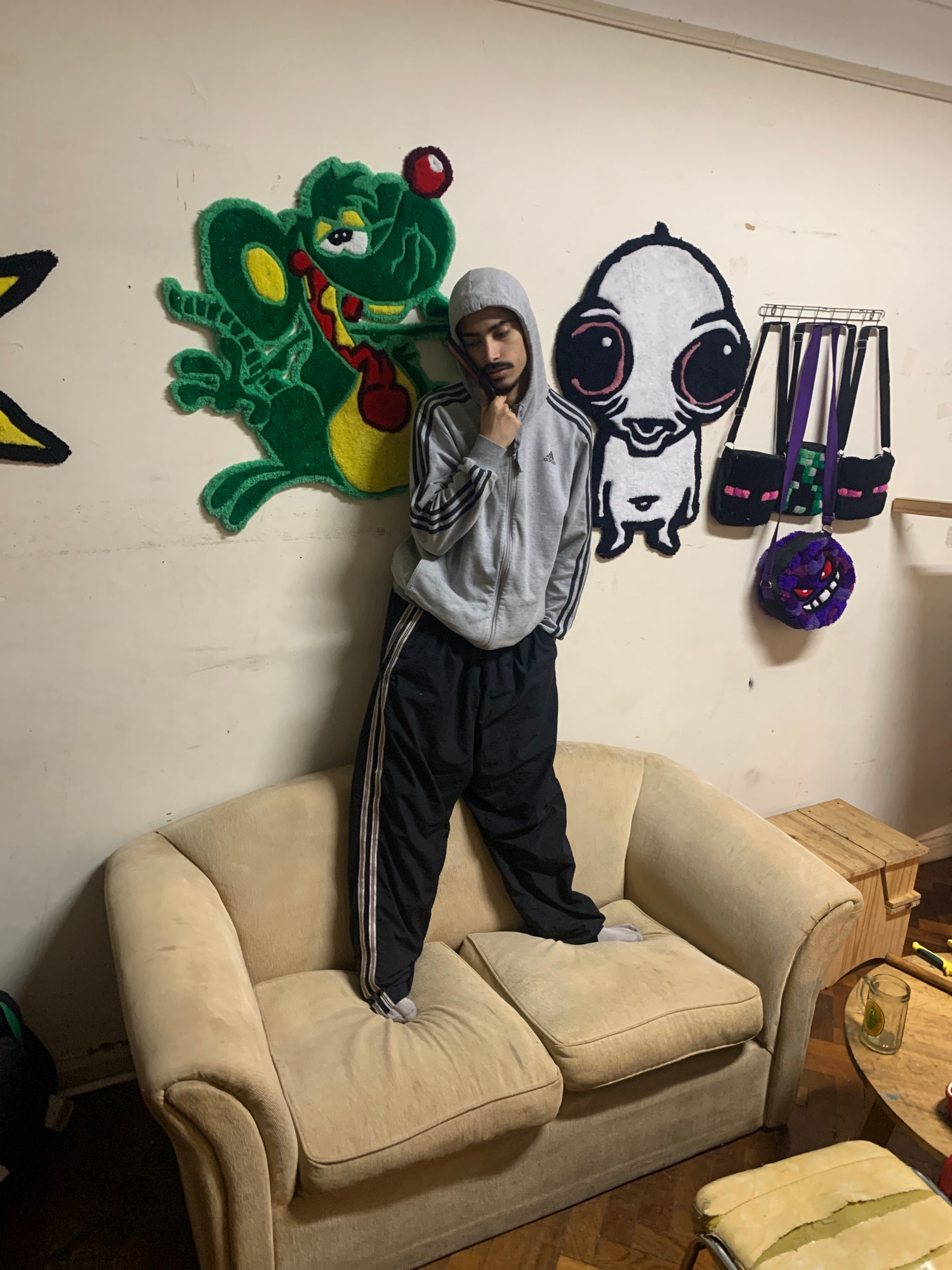 A person wearing a gray hoodie and black pants lies horizontally on a beige couch. The person's head is near a green cartoonish rug with a red cherry. The couch is situated against a wall decorated wi…read more