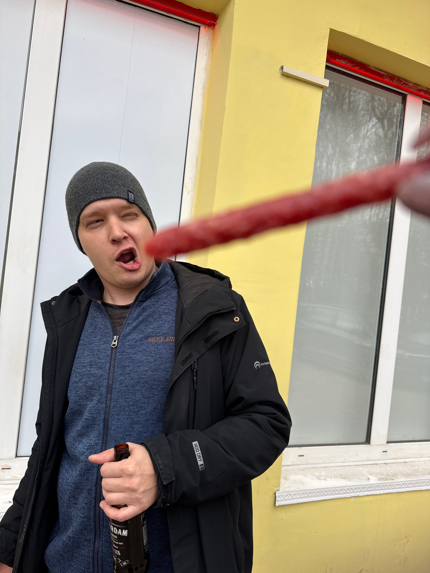 A man in a gray beanie, blue zip-up sweater, and black jacket stands in front of a yellow building in Dmitrov, Russia. He is holding a dark glass bottle in his right hand and his mouth is open as if h…read more