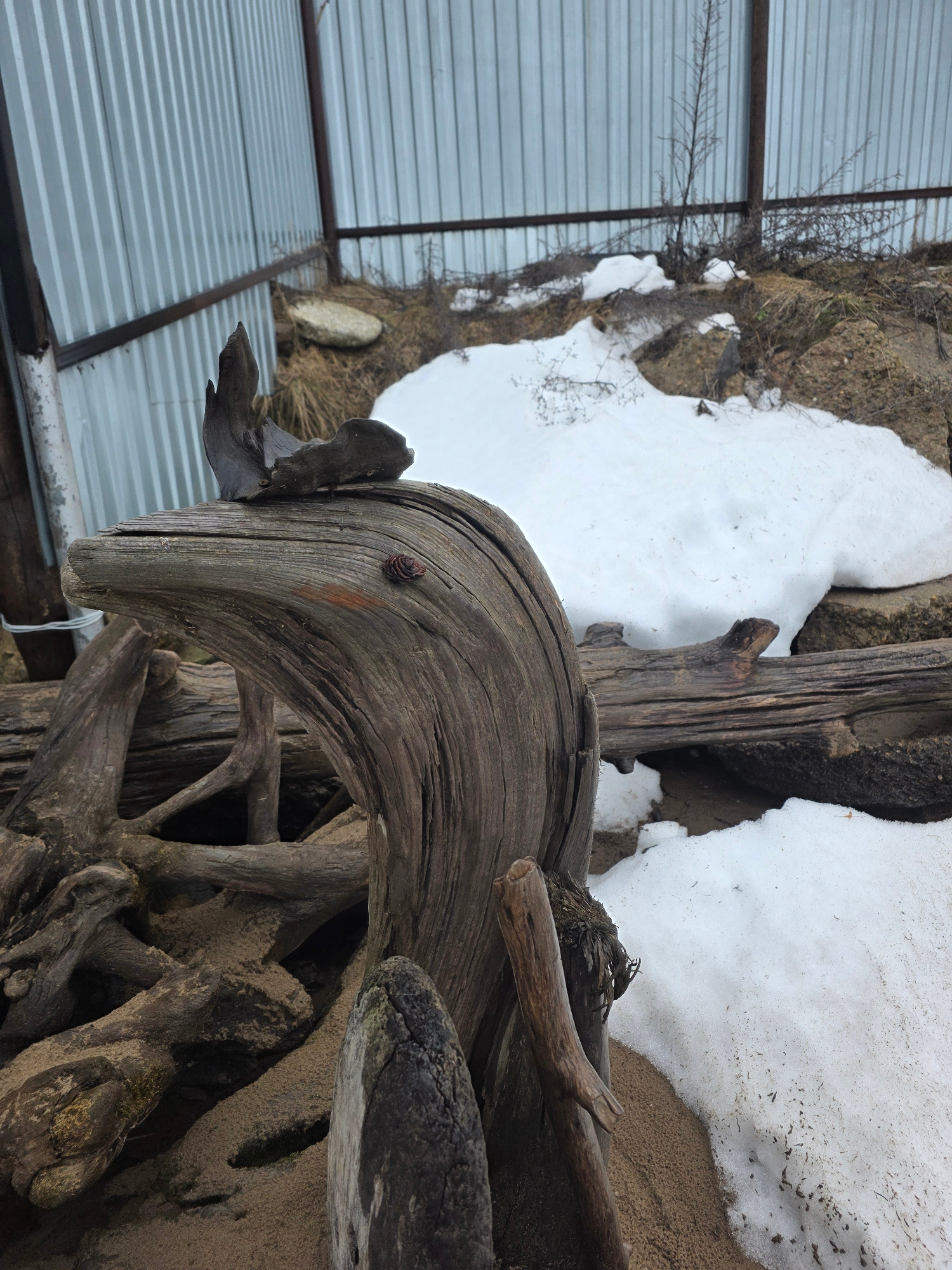 The image presents a wooden sculpture of a horse's head, appearing to be part of a larger artwork or display. The sculpture is made of weathered wood, showing the natural grain and texture. A small pi…read more