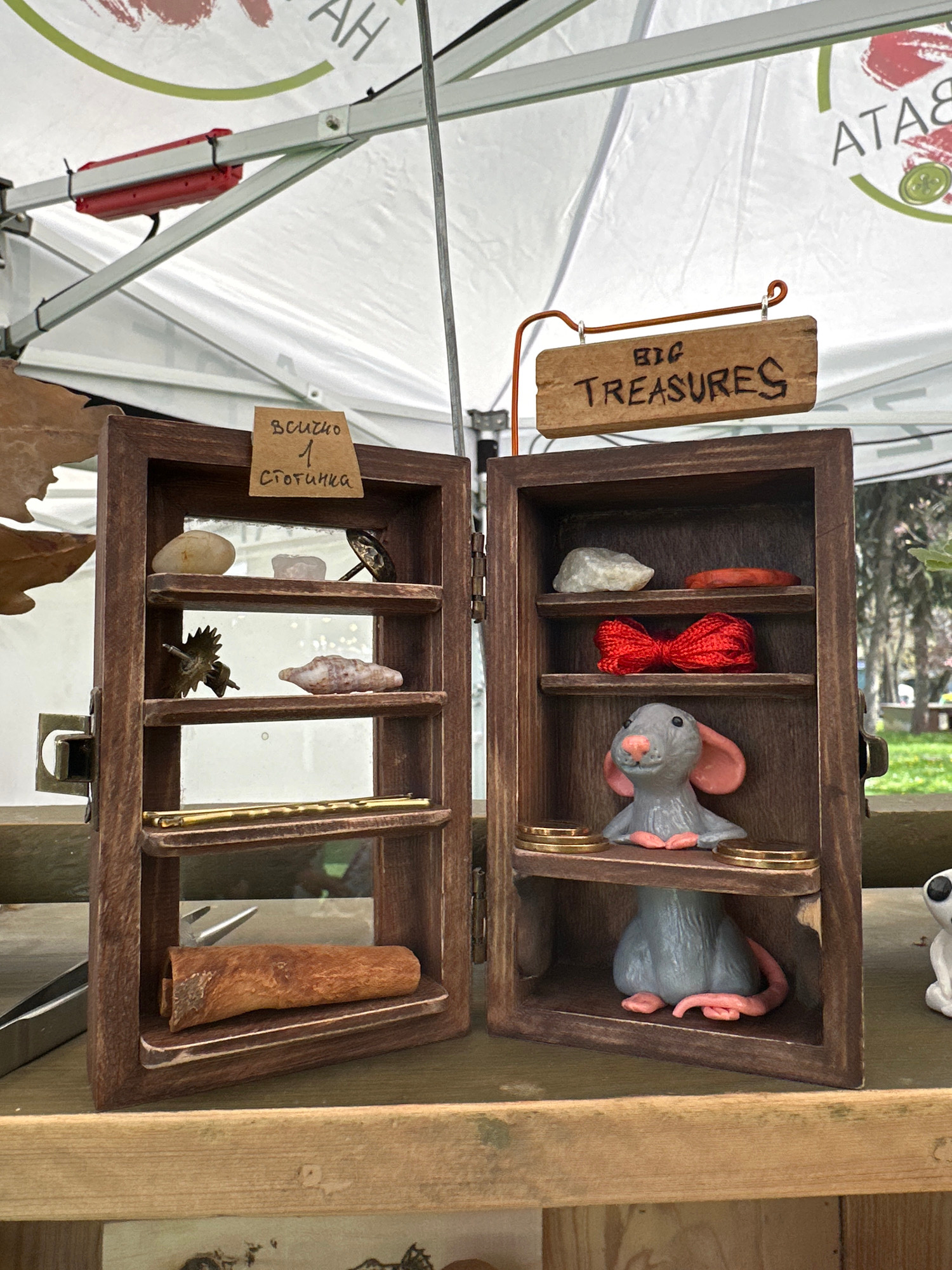 The image shows an open, wooden treasure chest with multiple compartments, each containing various small objects. The top section includes a piece of bark, a small gear, a shell, a rock, and a tag wit…read more