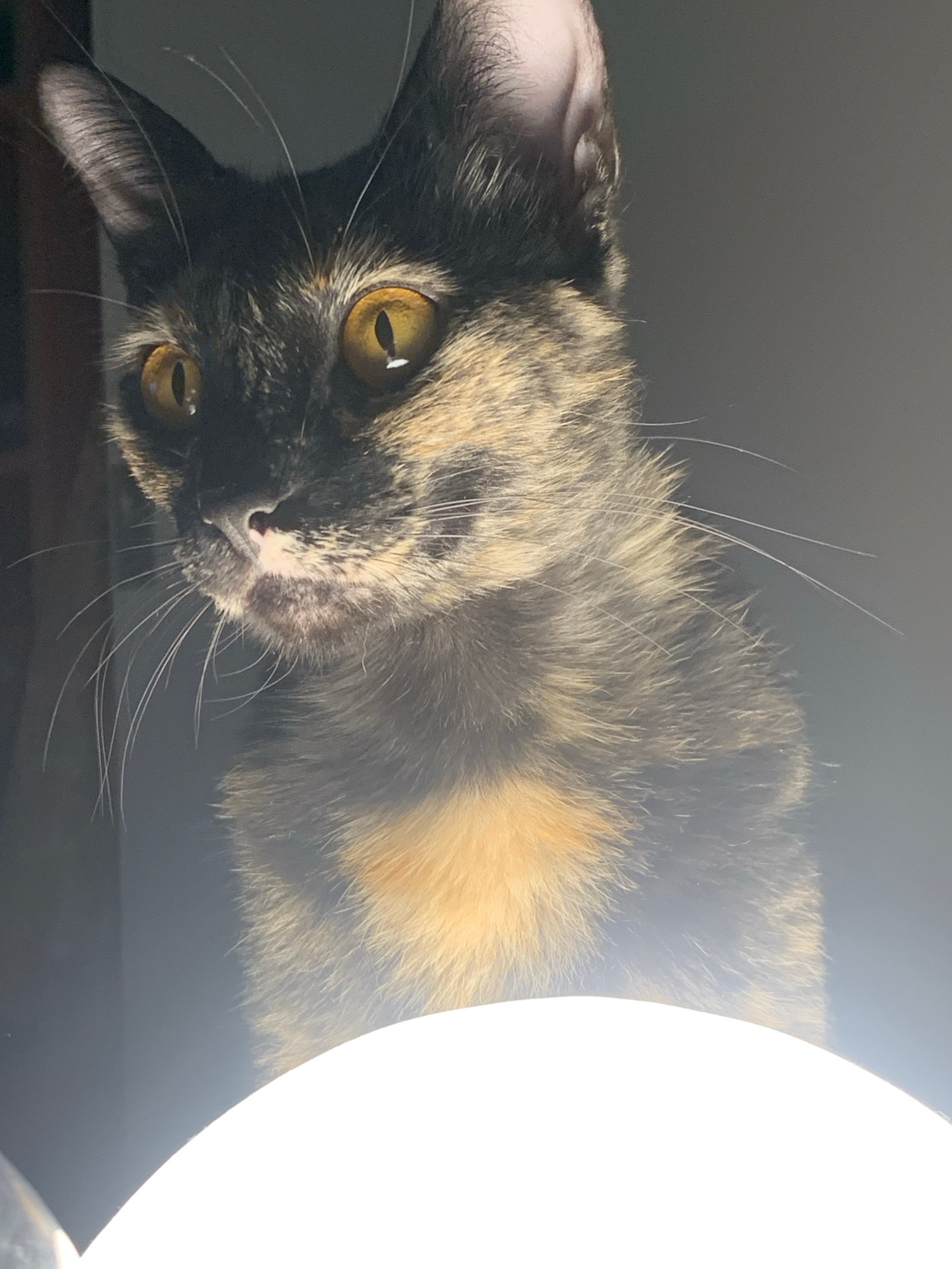 A tortoiseshell cat with golden eyes is seen from an inverted perspective, appearing to look directly at the viewer from above. The cat's fur is a mix of black and tan. A bright, out-of-focus light so…read more