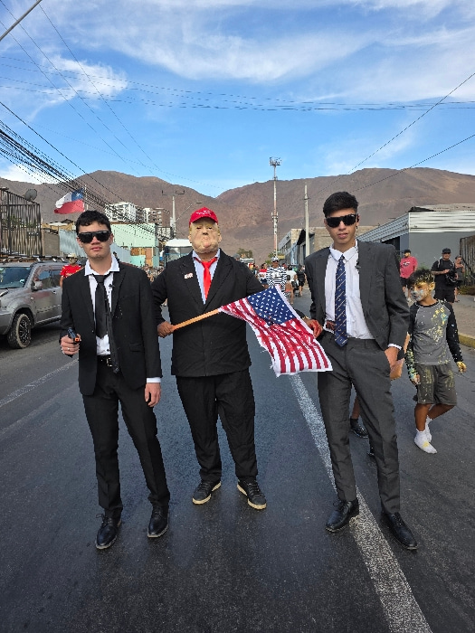Three individuals are standing abreast on an asphalt road with a faded white dividing line, directly facing the viewer. The leftmost figure is a young male, wearing a black suit, white dress shirt, bl…read more