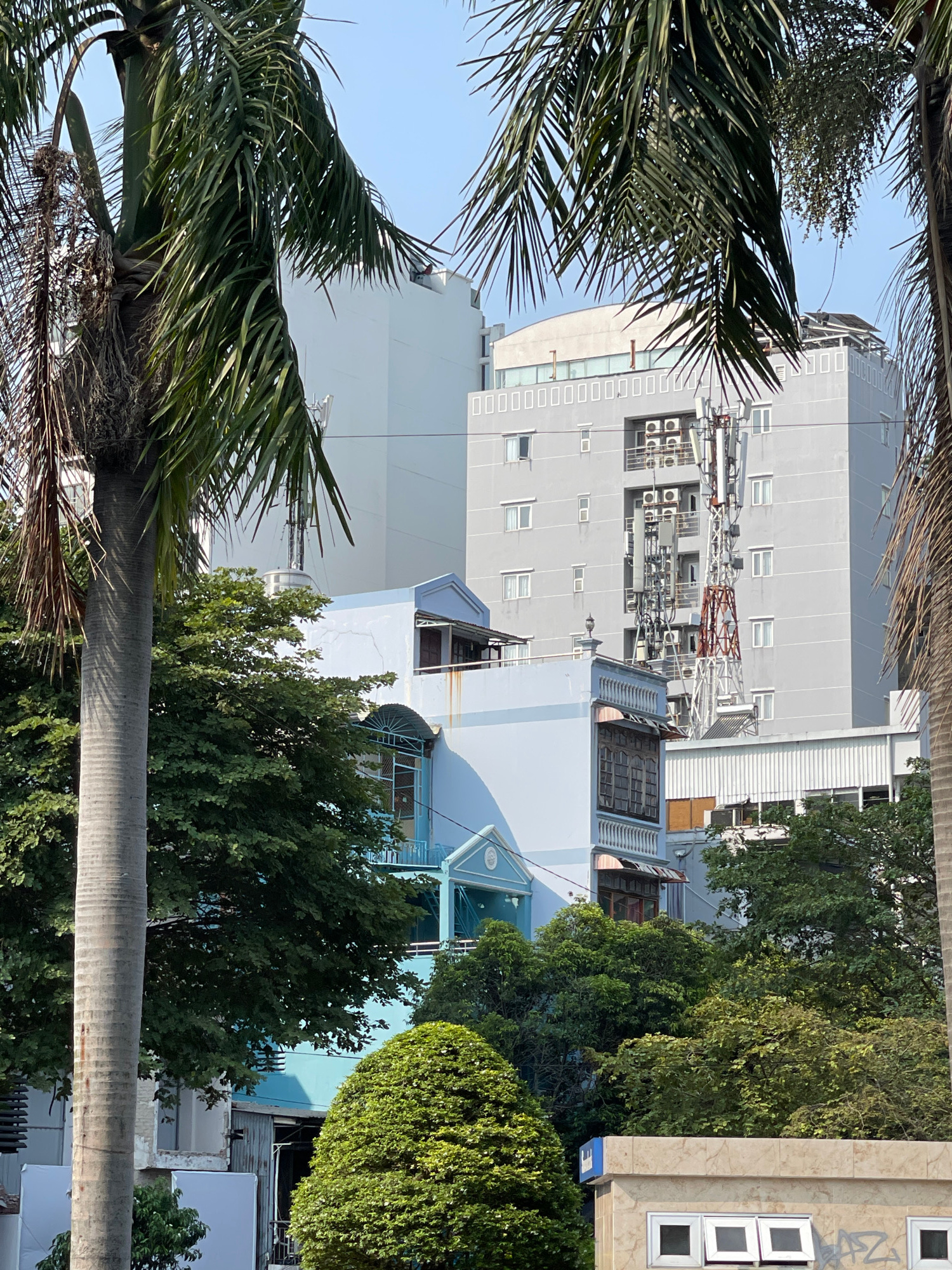 A photograph taken in Thủ Đức, Vietnam, reveals a mix of urban infrastructure and tropical vegetation under a clear sky. Tall, multi-story buildings are the dominant architectural features. One buildi…read more