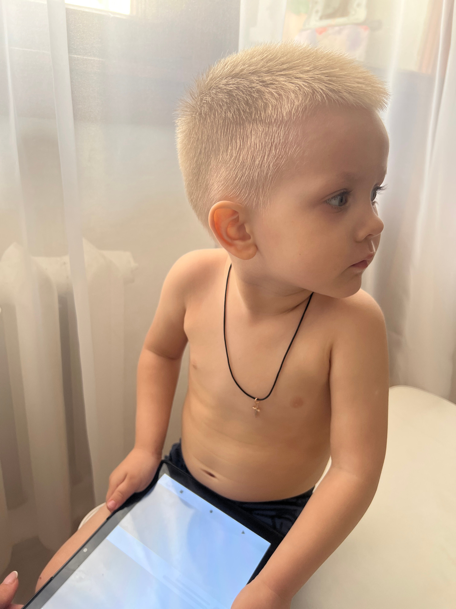 A young child, shirtless and with short, light blonde hair, is holding a tablet device. The child is wearing dark-colored bottoms and a thin necklace with a small charm. The background appears to be a…read more